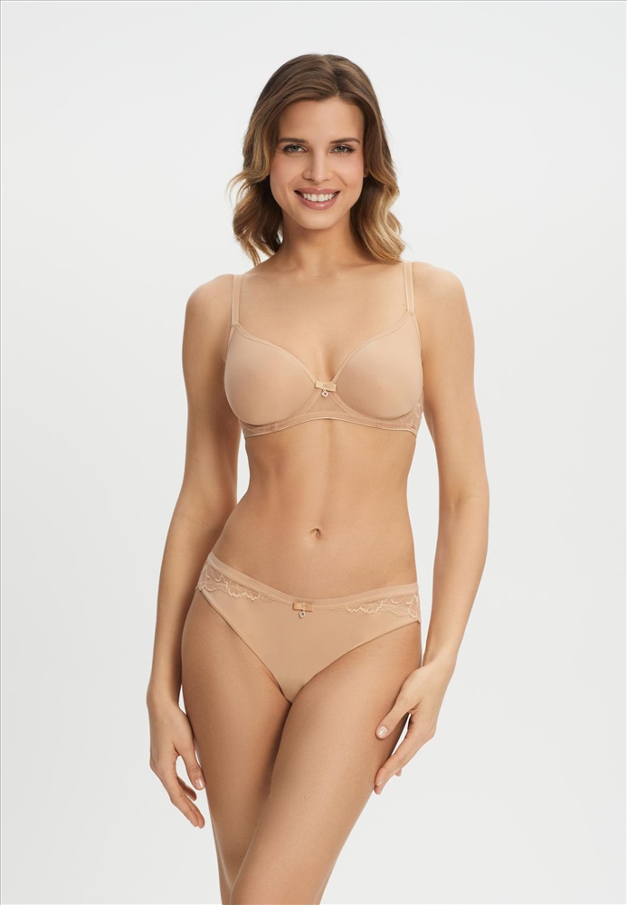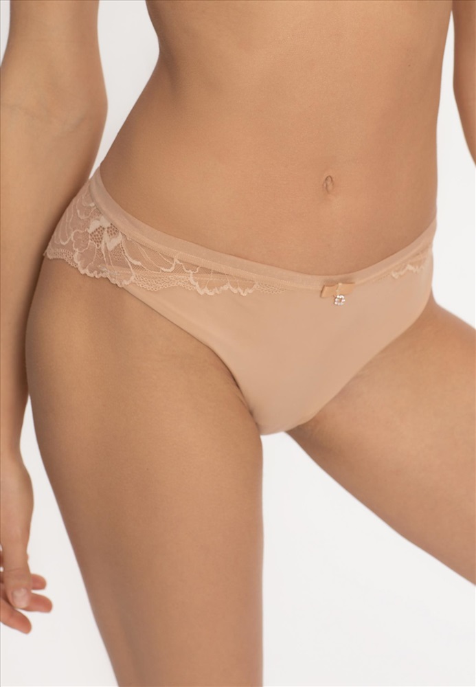Трусы-бразилиана со средней линией талии. Мягкая эластичная тесьма по верхнему краю. Передняя деталь из микрофибры. Задняя деталь выполнена из кружева с ажурными краями.