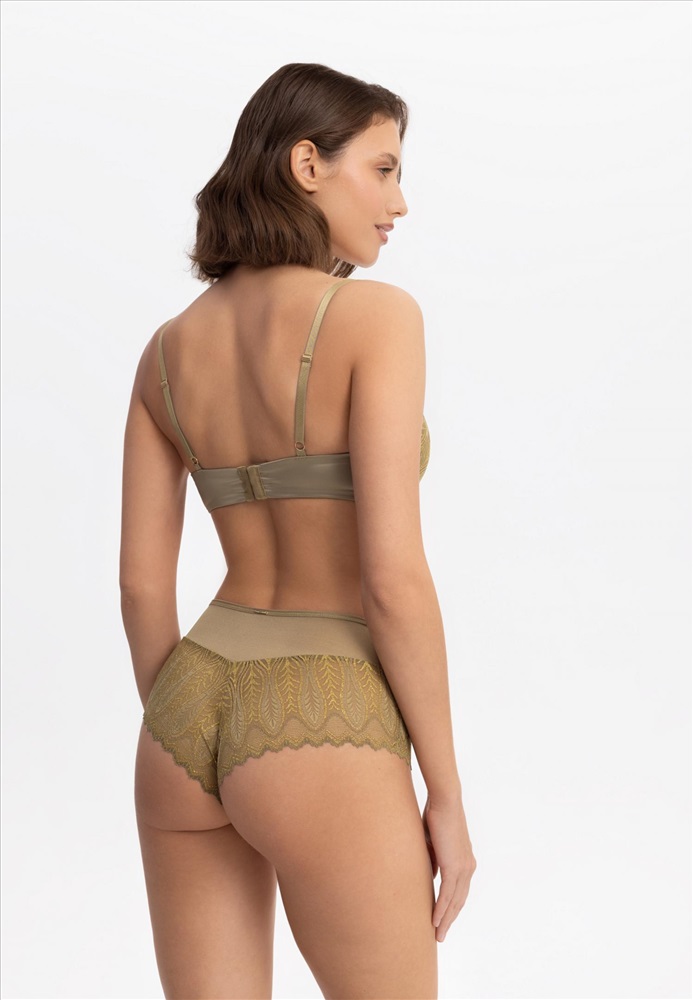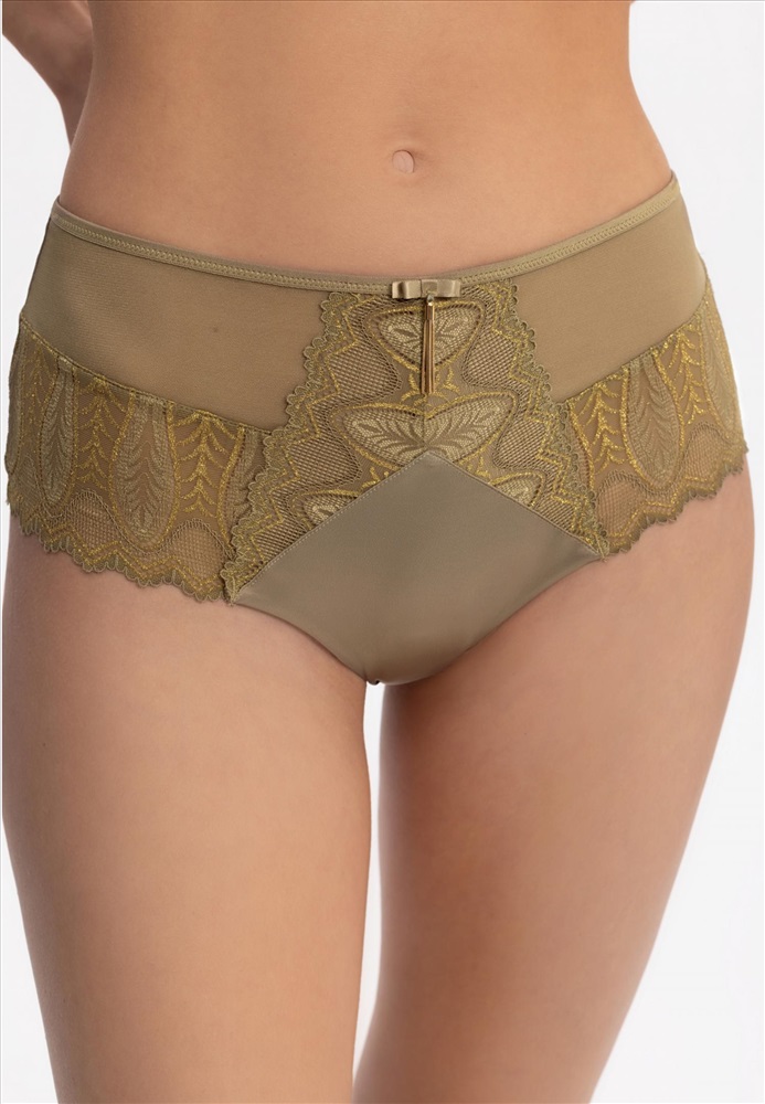 Трусы-хипстеры со средней линией талии. Передняя деталь из атласной микрофибры, сетки и кружева. Задняя деталь выполнена из сетки и кружева с ажурными краями.