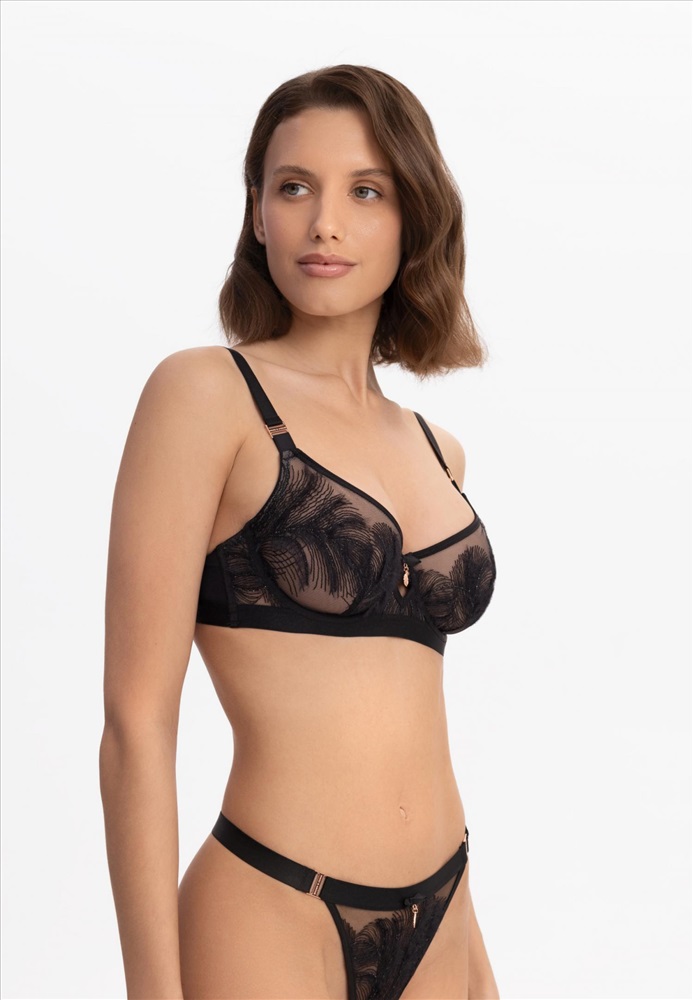 Бюстгальтер с мягкой чашкой на каркасной поддержке. Внутренняя поверхность чашки выполнена из эластичной сетки. Чашка украшена вышивкой с декоративными перышками по сетке. Стан из двойной сетки. Под грудью эластичная резинка для дополнительной поддержки. Широкие бретели украшены аксессуаром.
