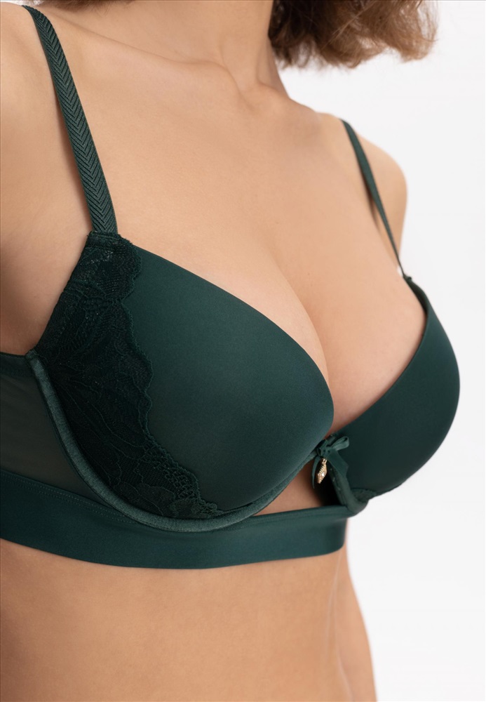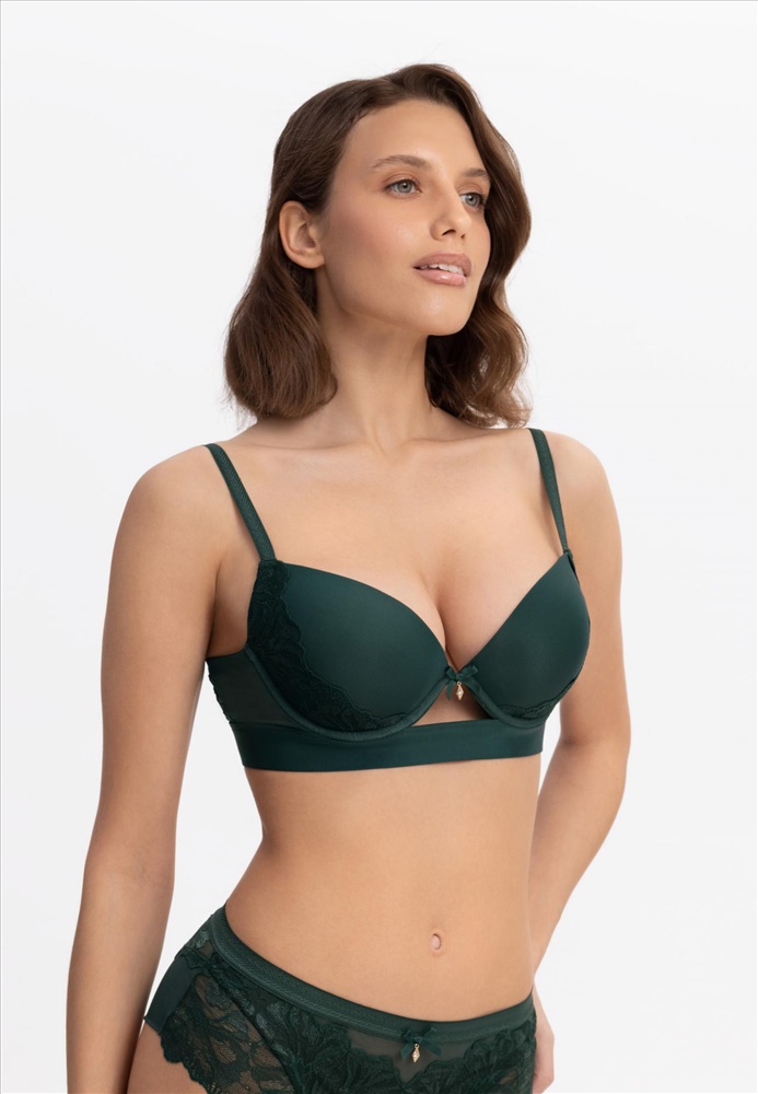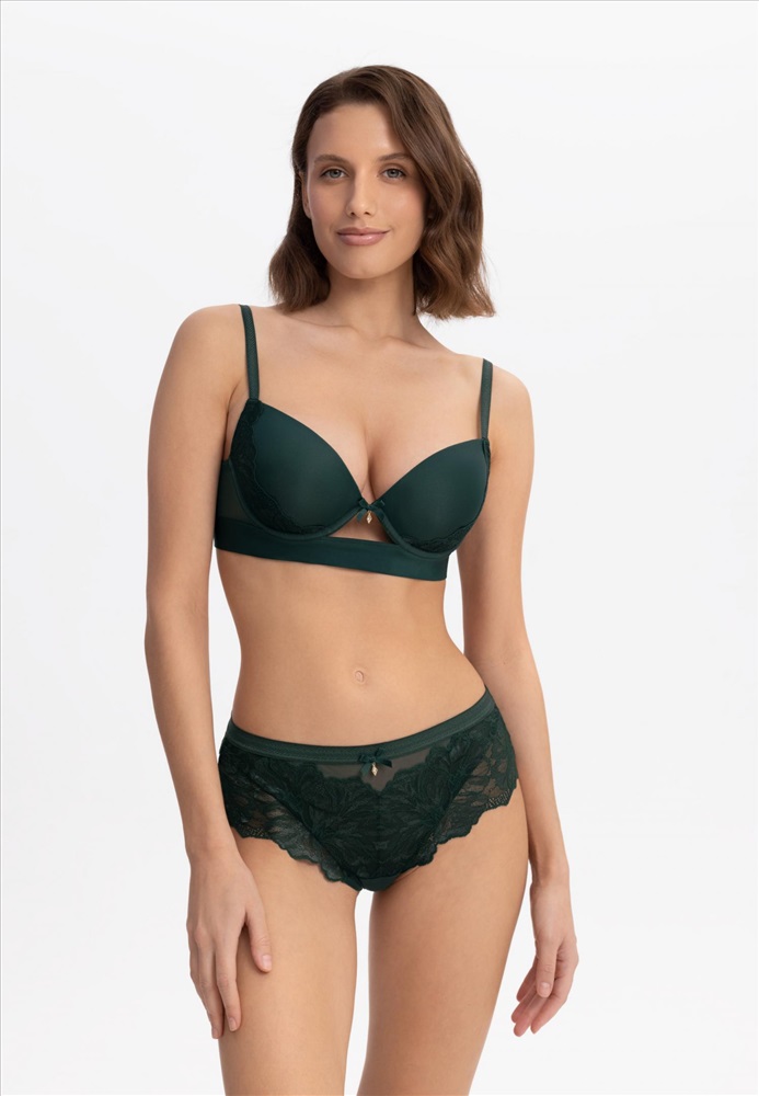 Бюстгальтер на каркасной поддержке с формованной чашкой и встроенным «пуш-ап». Широкий стан с эластичной резинкой внутри обеспечивает дополнительную поддержку. Боковые детали выполнены из сетки. Спинка декорирована кружевом.