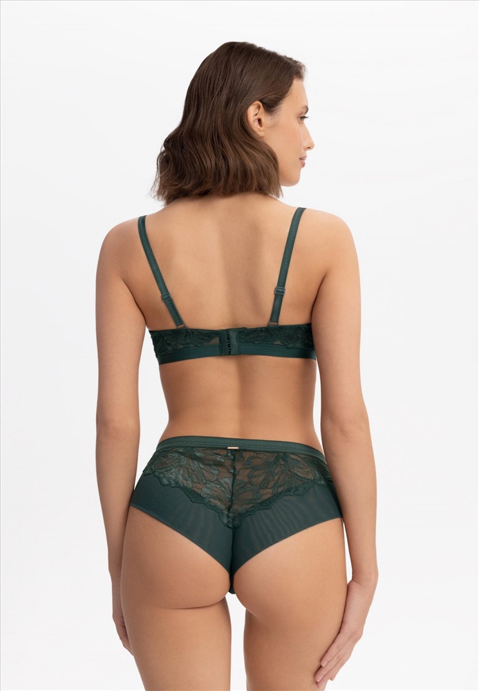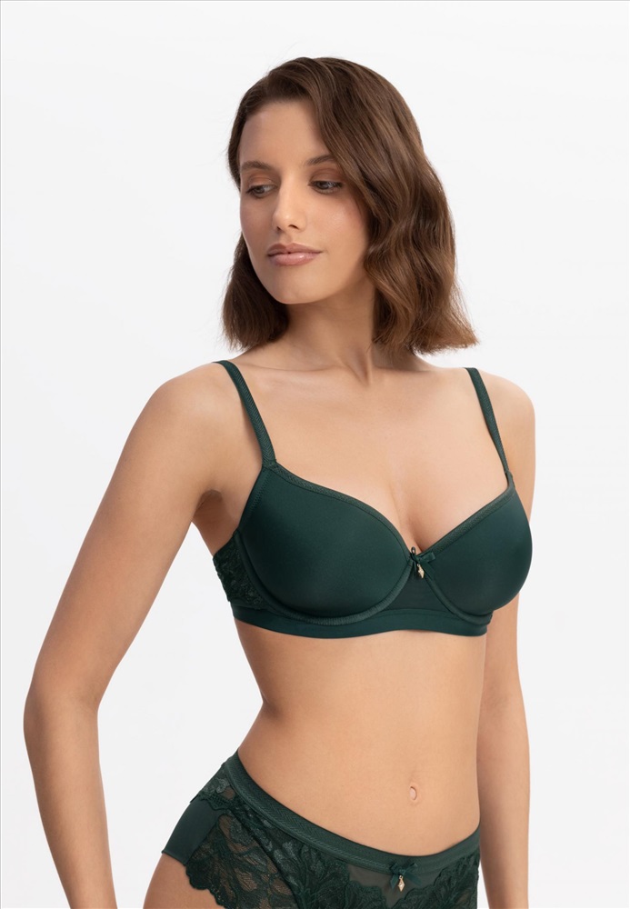 Бюстгальтер с формованной чашкой «Spacer» на каркасной поддержке. Боковые детали из сетки декорированы кружевом. Эластичная тесьма под грудью обеспечивает дополнительную поддержку.