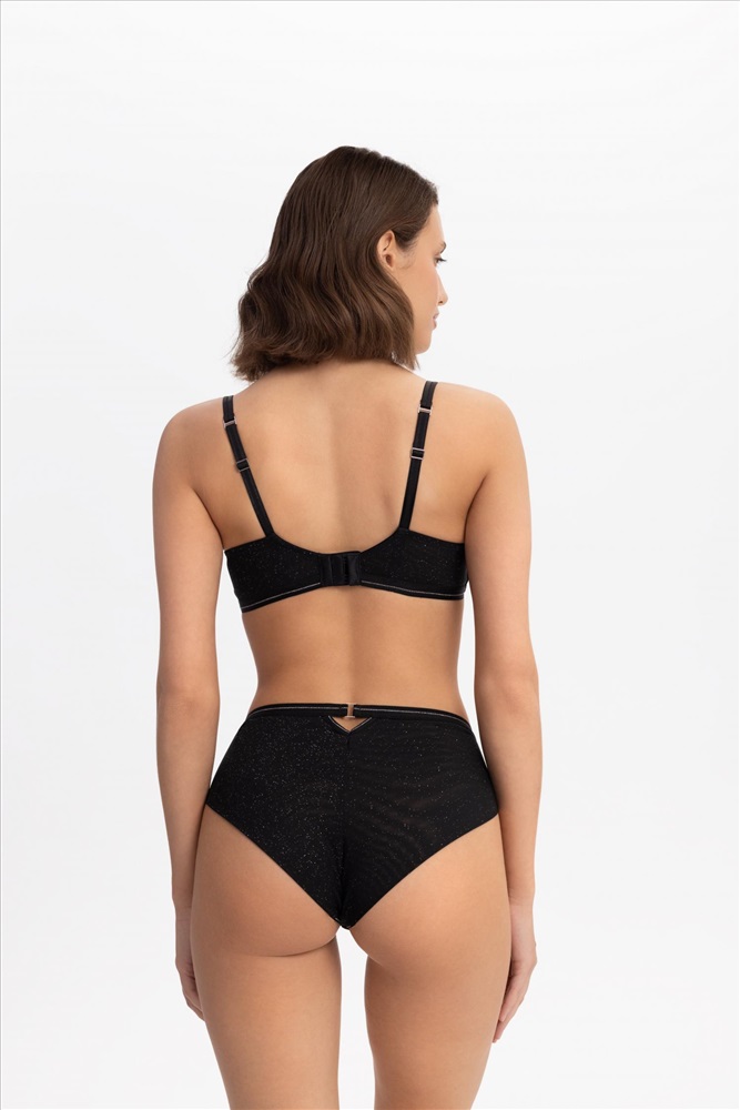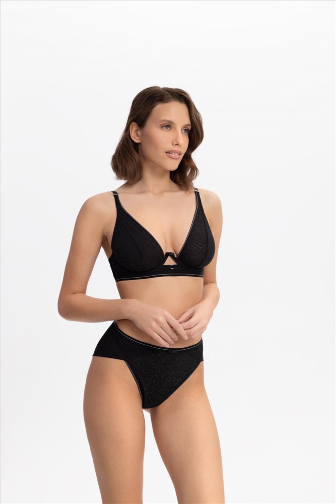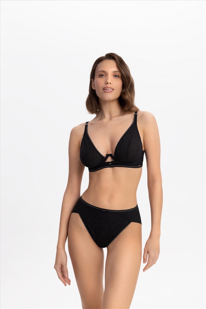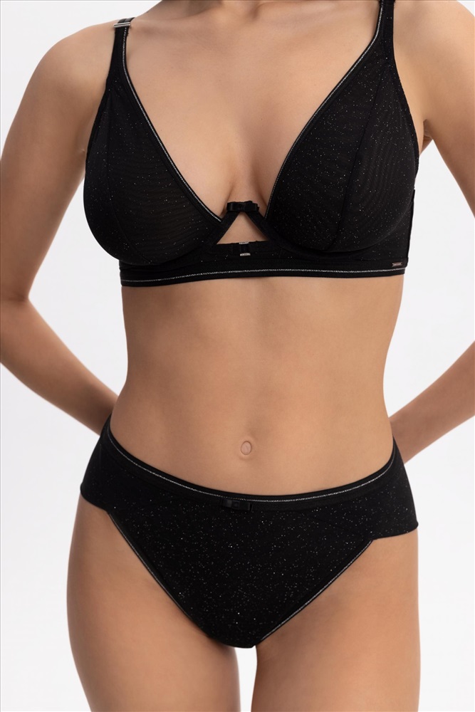 Бюстгальтер с мягкой треугольной чашкой на каркасной поддержке. Углубленная V-образная линия декольте оформлена эластичной тесьмой с серебристой нитью. Чашки выполнены из полупрозрачной сетки с микроблестками на подкладке из эластичной сетки mesh. Стан из эластичной сетки с микроблестками на подкладке из сетки. Боковые косточки. Поддерживающая резинка под грудью. Круглая спинка.