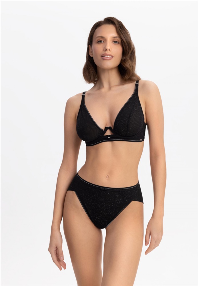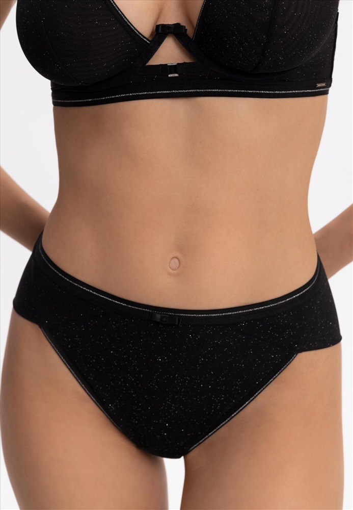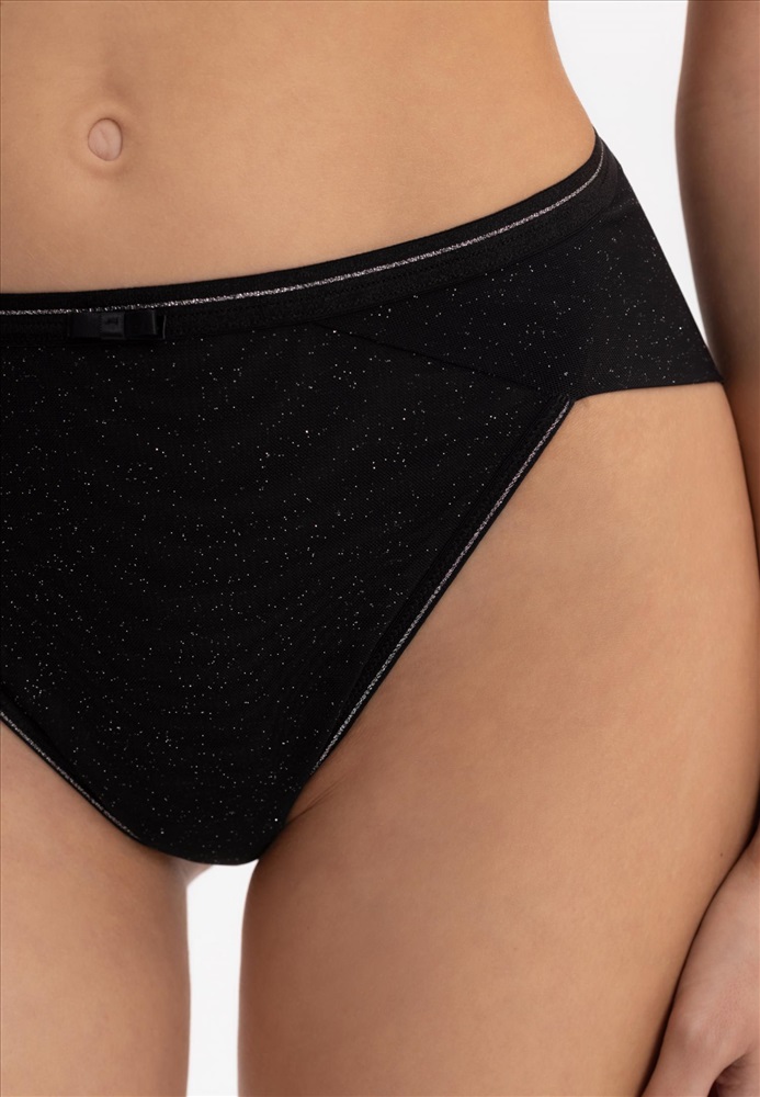 Трусы-бразилиана с завышенной линией талии. Передняя деталь из эластичной сетки с микроблестками на подкладке. Задняя деталь: двойная сетка с микроблестками в подворот. Пояс выполнен из эластичной тесьмы с серебристой нитью.
