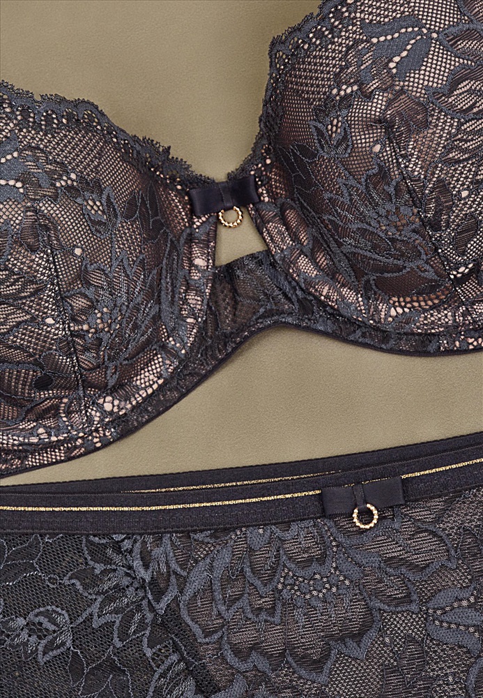 Бюстгальтер с формованной чашкой и съёмными корректорами «пуш-ап» на каркасной поддержке. Внутренняя часть чашки дублирована хлопком. Перекрест деталей из микрофибры и кружева на боковой панели. Круглая спинка.