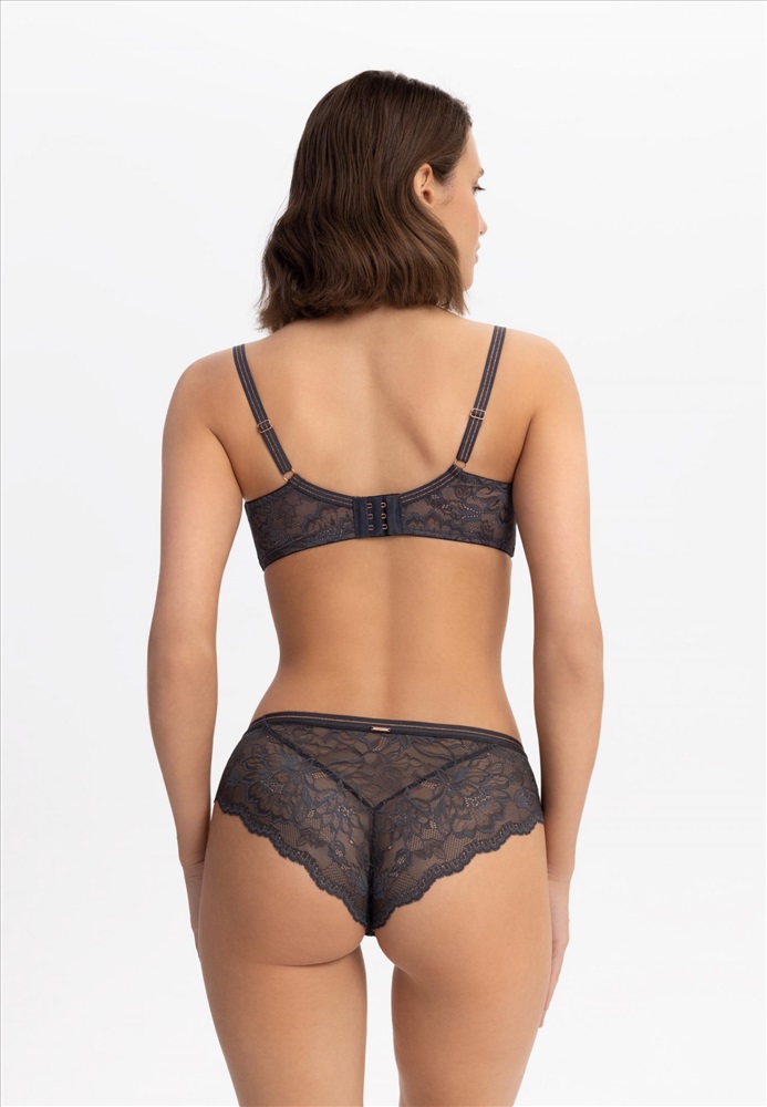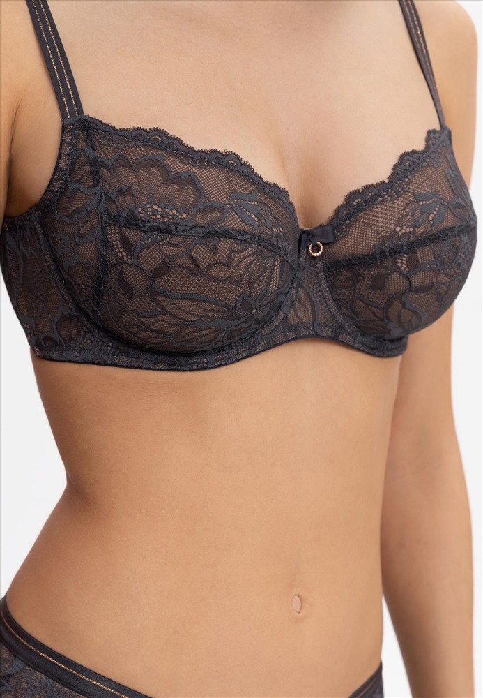 Бюстгальтер с мягкой кружевной чашкой на каркасной поддержке. Чашка c боковым подкроем. Внутренняя поверхность дублирована эластичной сеткой. Кружевной стан на подкладке из сетки. Боковые поддерживающие косточки. Бретели декорированы двойной золотой нитью. Круглая спинка.