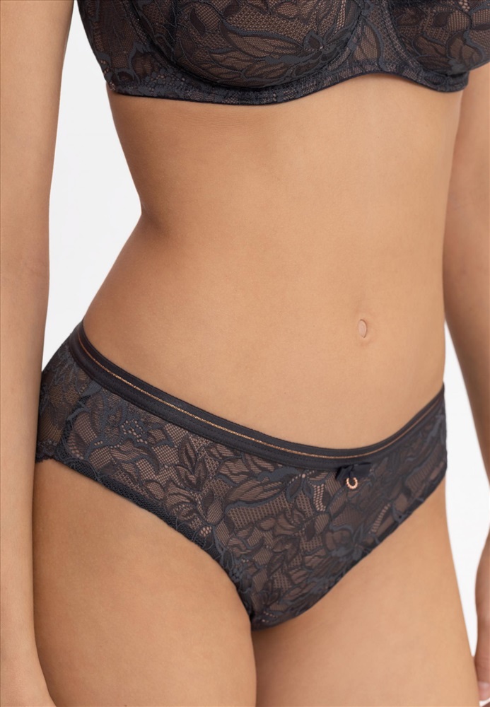 Трусы-бразилиана со средней линией талии. Пояс из эластичной тесьмы декорирован золотой нитью. Передняя деталь из кружева на подкладке из сетки. Задняя деталь из кружева с ажурными краями.