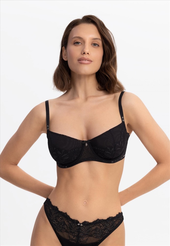 Бюстгальтер с мягкой чашкой на каркасной поддержке. Чашки выполнены из двойной полупрозрачной сетки и декорированы кружевом. Кружевной стан на подкладке из сетки.