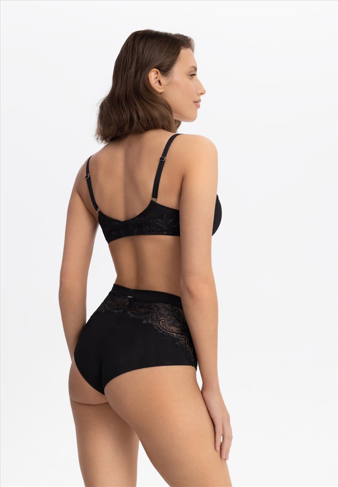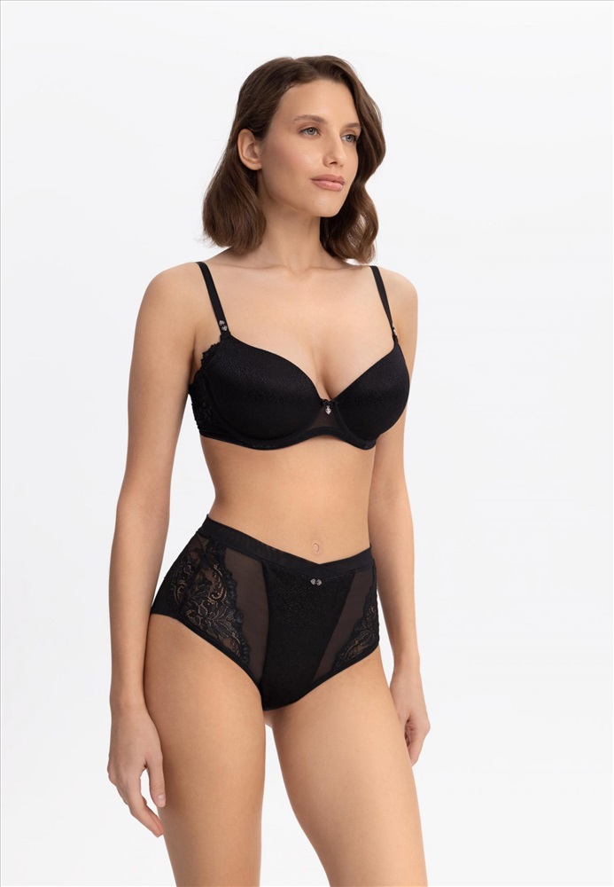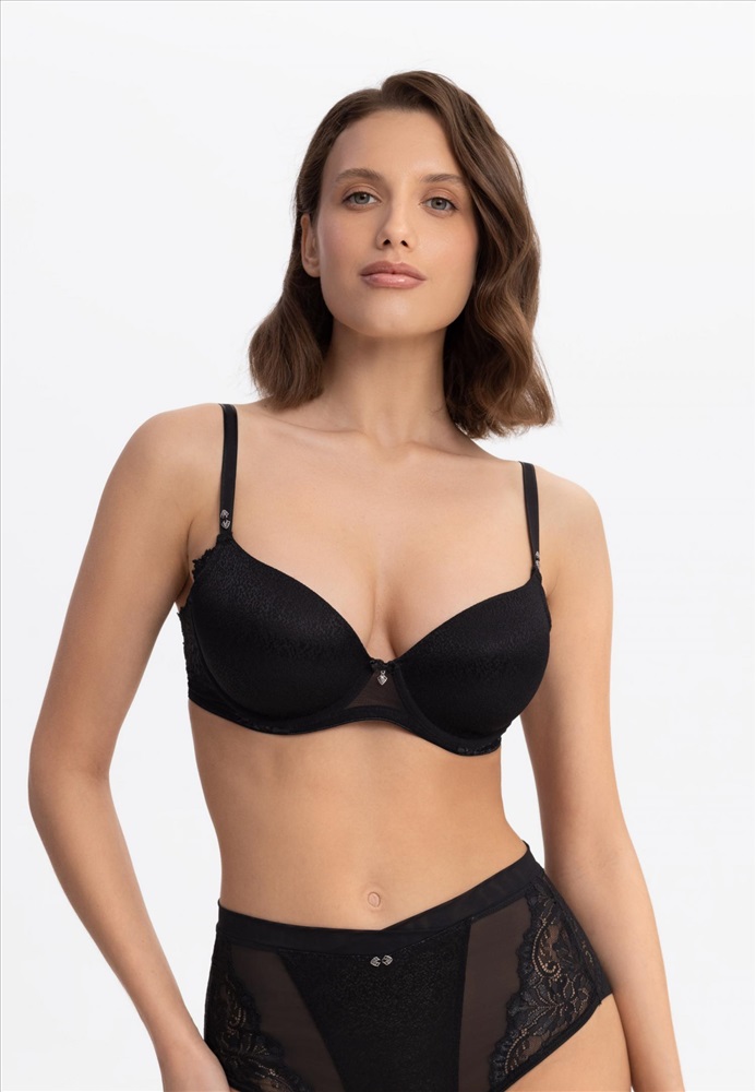 Бюстгальтер с формованной чашкой и съёмными корректорами «пуш-ап» на каркасной поддержке. Перекрест деталей из сетки и кружева на боковых панелях. Круглая спинка.