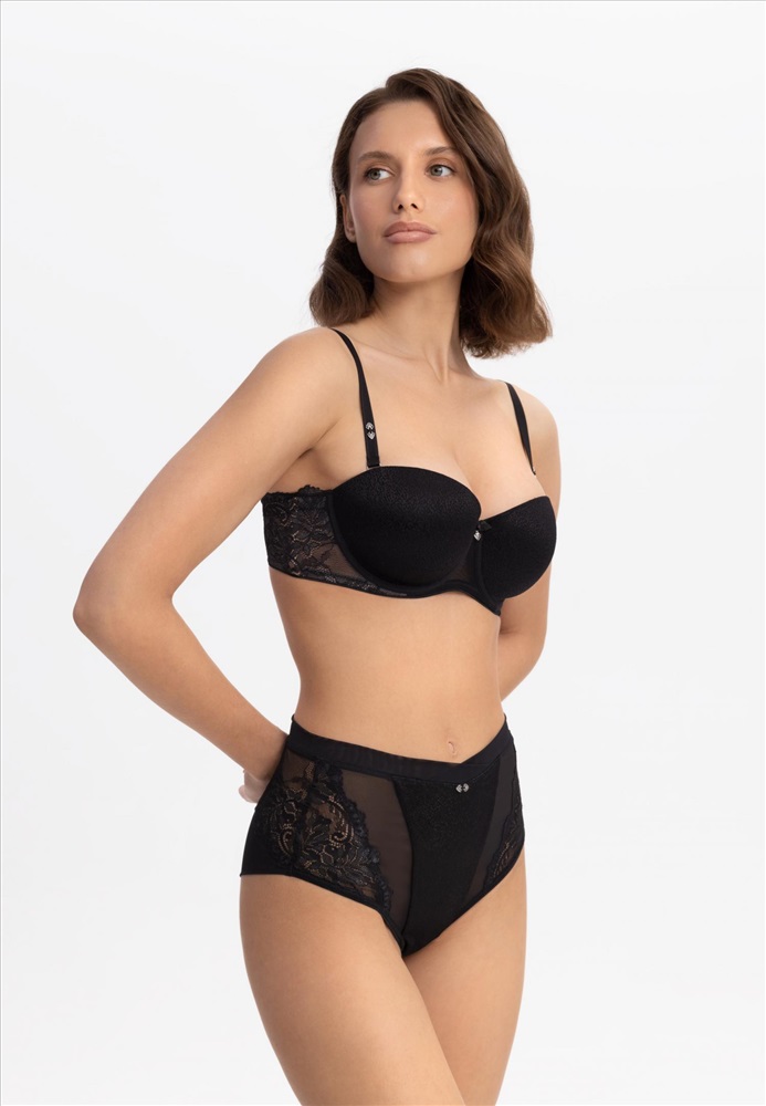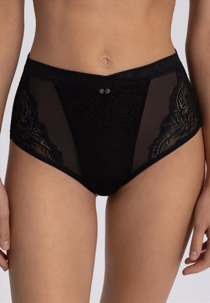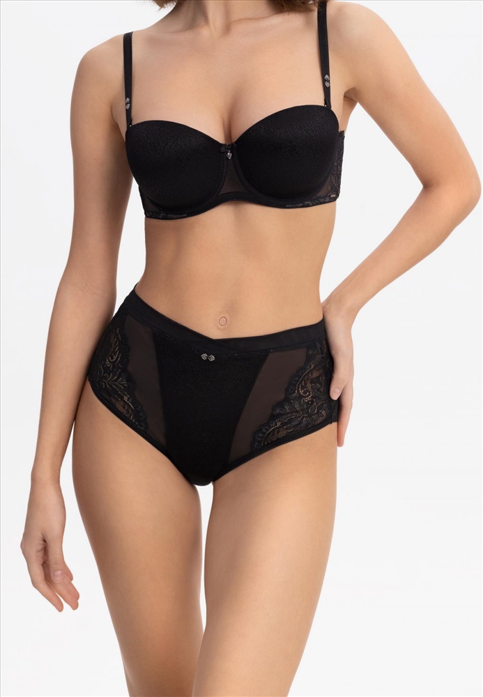 Трусы-бразилиана с завышенной линией талии. Передняя деталь из микрофибры и сетки. Задняя деталь из двойной сетки в подворот с кружевными вставками. Боковые детали из эластичного кружева.