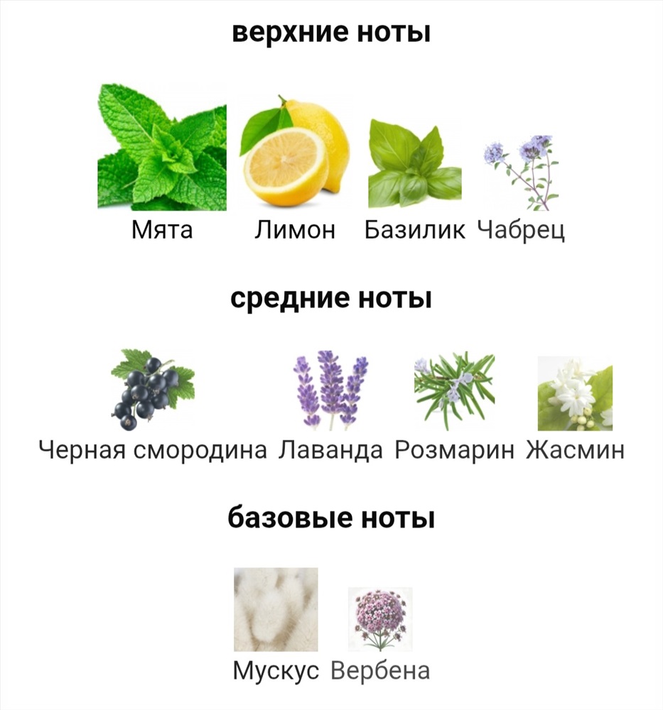 Верхние ноты: Мята, Лимон, Базилик и Чабрец; средние ноты: Черная смородина, Лаванда, Розмарин и Жасмин; базовые ноты: Мускус и Вербена.