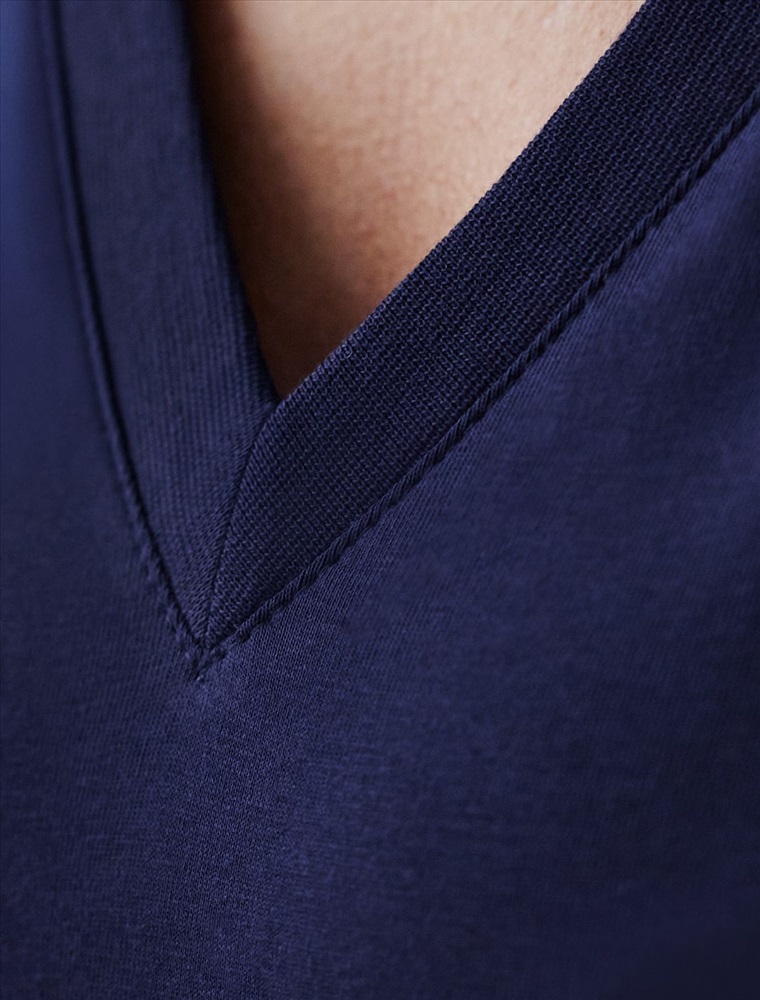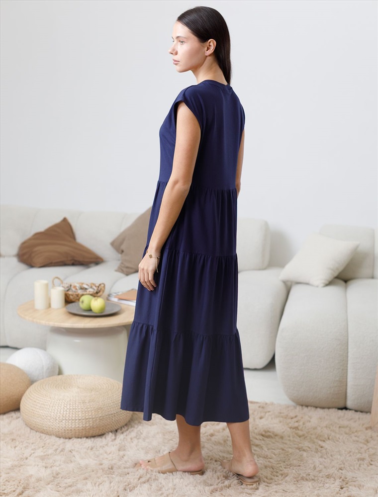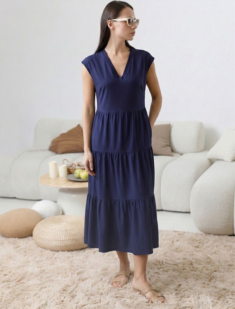 Стильное платье миди с V вырезом благородного темно-синего цвета выполнено из 100% хлопка плотностью 140 Г/м2. Главная особенность этого изделия — тонкое кулирное полотно, которое легче и воздушнее стандартного трикотажа. Благодаря своей деликатной текстуре модель идеально подходит для домашних образов и пижамных комплектов. Ткань отлично «дышит», обеспечивая максимальный уют во время сна и отдыха. Платье ярусного кроя красиво подчеркивают фигуру, скрывая возможные недостатки и акцентируя достоинства. Свободное платье отлично подойдет на большие размеры. Длина платья миди обеспечивает гармоничное сочетание комфорта и элегантности, подходя для разных поводов. V-образное декольте придает образу нежность и женственность, а ярусная конструкция добавляет образу эффект воздушности и динамичность. Материал натуральный и приятный к телу, создает ощущение легкости и свежести. Такое повседневное платье подчеркнет индивидуальность и стиль.