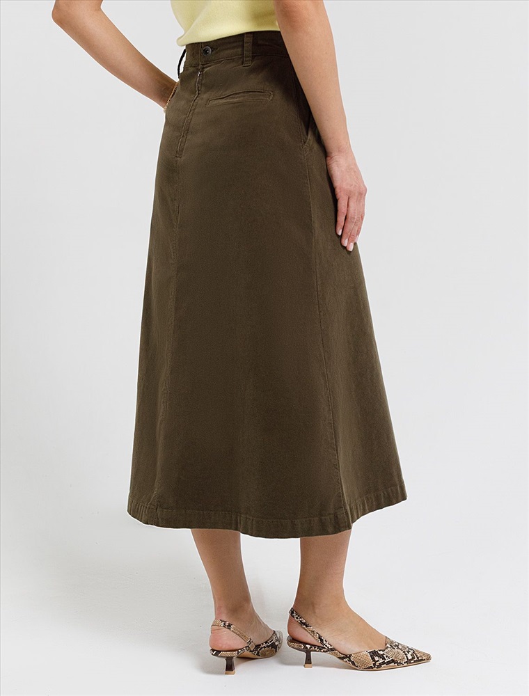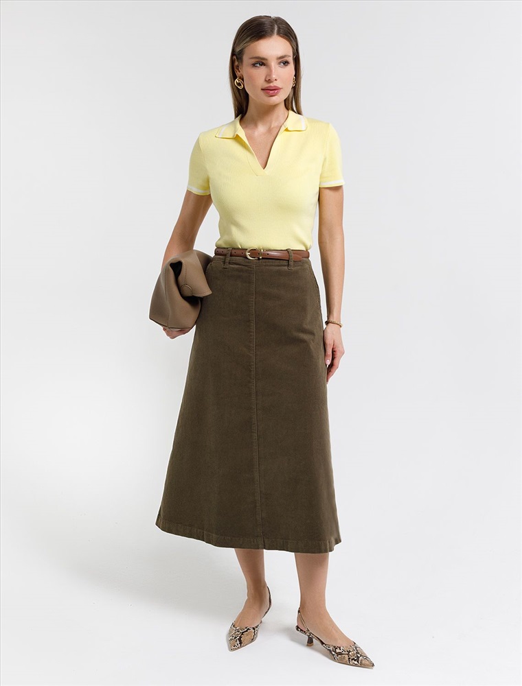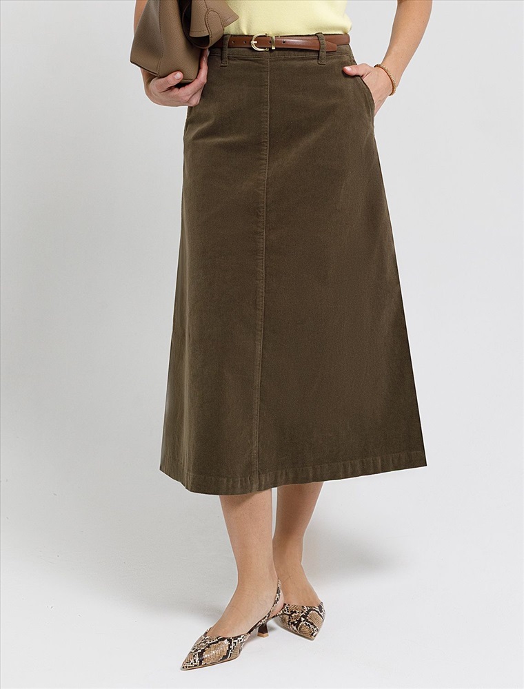 Размер товара на первом фото: 42 Юбка-миди трапециевидного силуэта выполнена из мягкого хлопкового микро-вельвета с добавлением эластана. Изделие комфортно садится по фигуре и не сковывает движения. Модель дополнена высококачественной фурнитурой с фирменным логотипом бренда. Хорошо комбинируется с вязаным трикотажем, блузками и денимом.Также прекрасно станет альтернативой деловым низам в нестрогом офисном дресс-коде.
