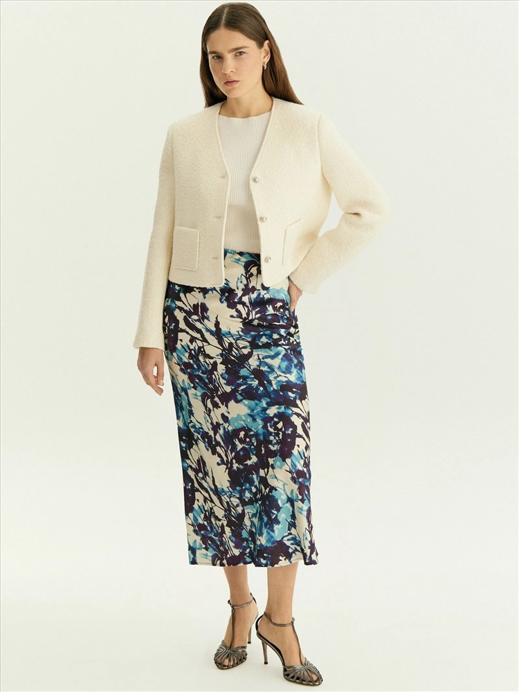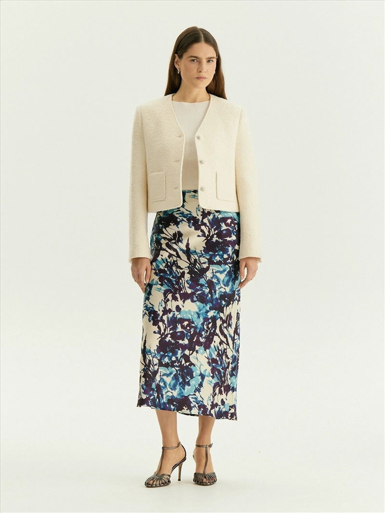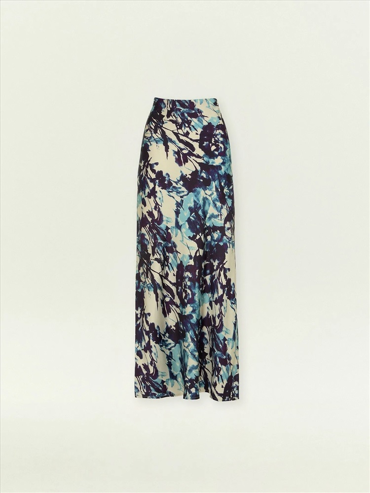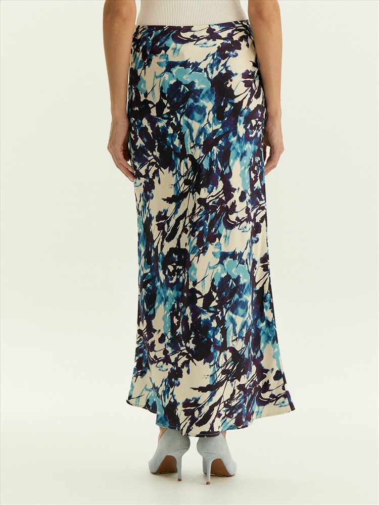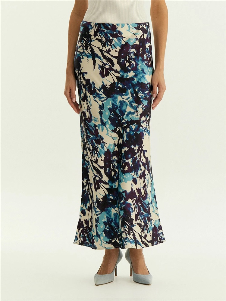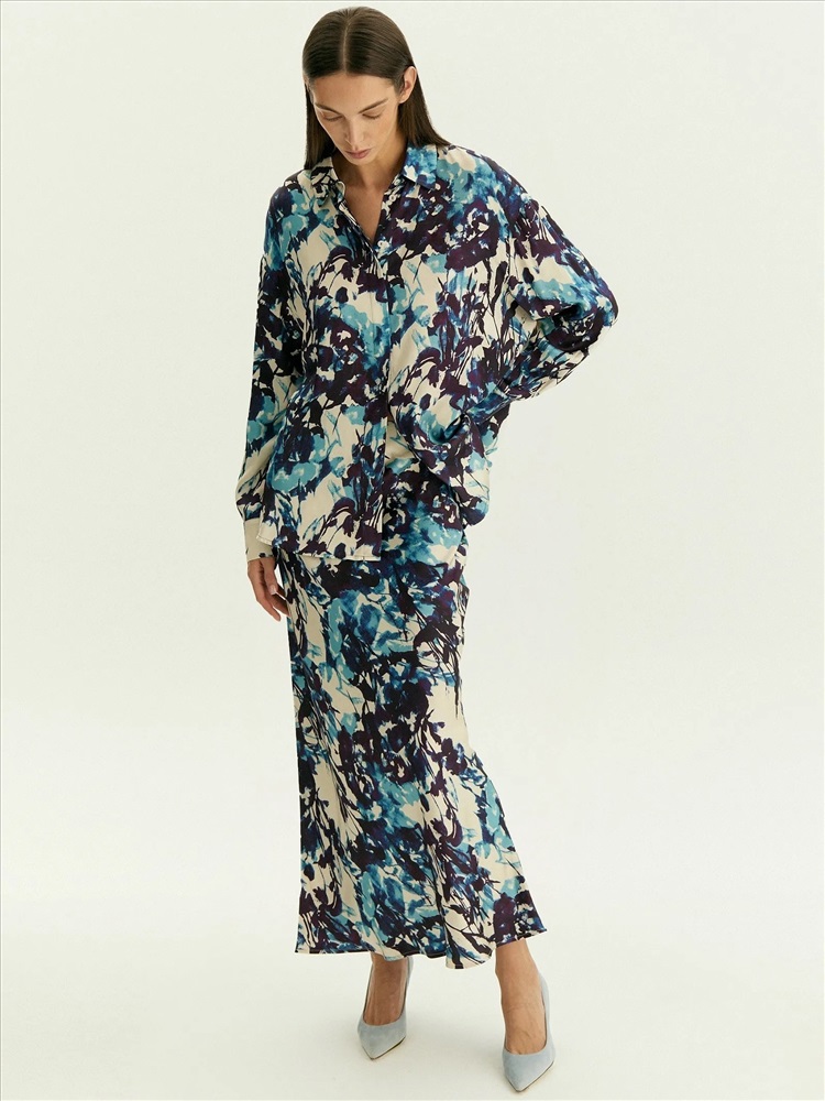 Юбка для нежных образов к особому случаю или на каждый день. Сделана из нежной, шелковистой вискозы и украшена актуальным принтом. Абстрактная композиция на основе растительных мотивов соединяет в себе трендовые оттенки фиолетового и синего. Модель А-силуэта в длине миди имеет высокую посадку. Скроена по косой, чтобы обеспечить красивую посадку по фигуре. Застёгивается на молнию сбоку. Выполнена без подкладки. Завершить образ можно блузой из комплекта, шёлковым топом, простой белой рубашкой или другим вариантом верха.