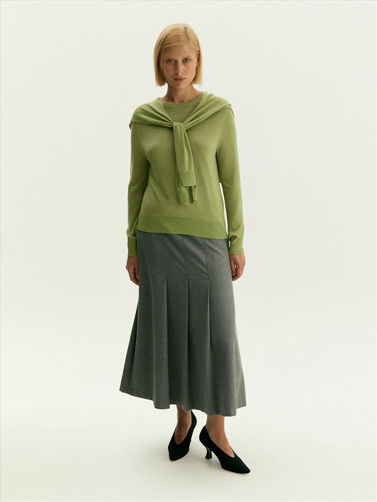 Тёплая зимняя юбка для повседневных образов. Модель французской длины с встречными складками визуально вытягивает силуэт. Интересно смотрится с кардиганами и жилетами, дополнит джемпер или свитер, а также классические офисные рубашки.