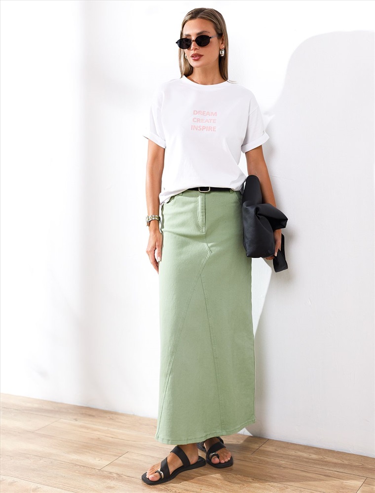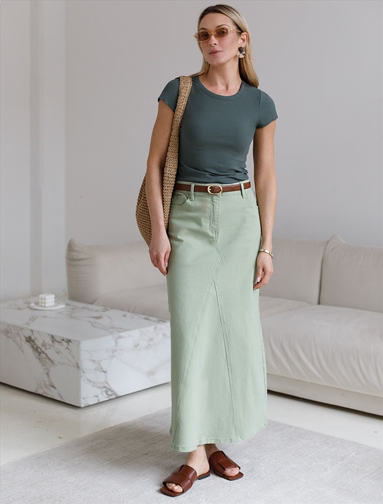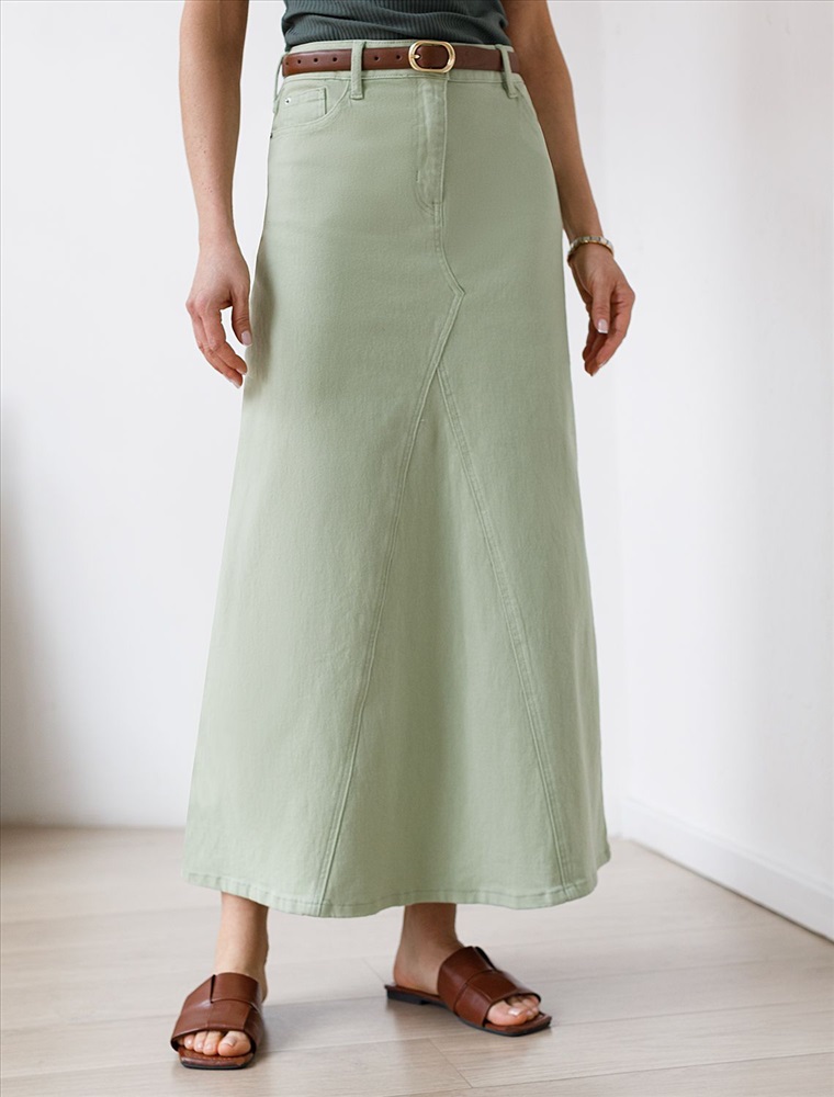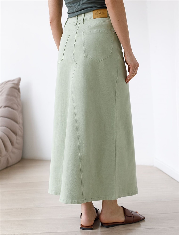 Параметры модели на первом фото: Рост 172, бюст 88, талия 64, бедра 88 Юбка А-силуэта выполнена из денима с эластаном. Модель с посадкой на талии расширяется к низу за счет вставок из декоративных клиньев, расположенных спереди и сзади. Изделие дополнено пятью карманами как у джинс и брендированным патчем из эко-кожи. Сочетается в комплекте с курткой D51.033