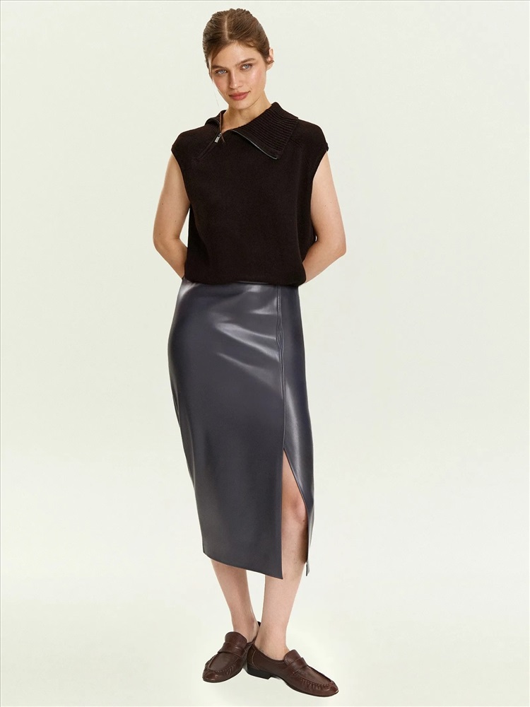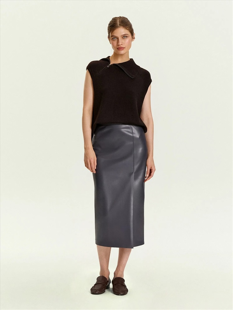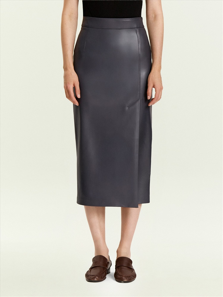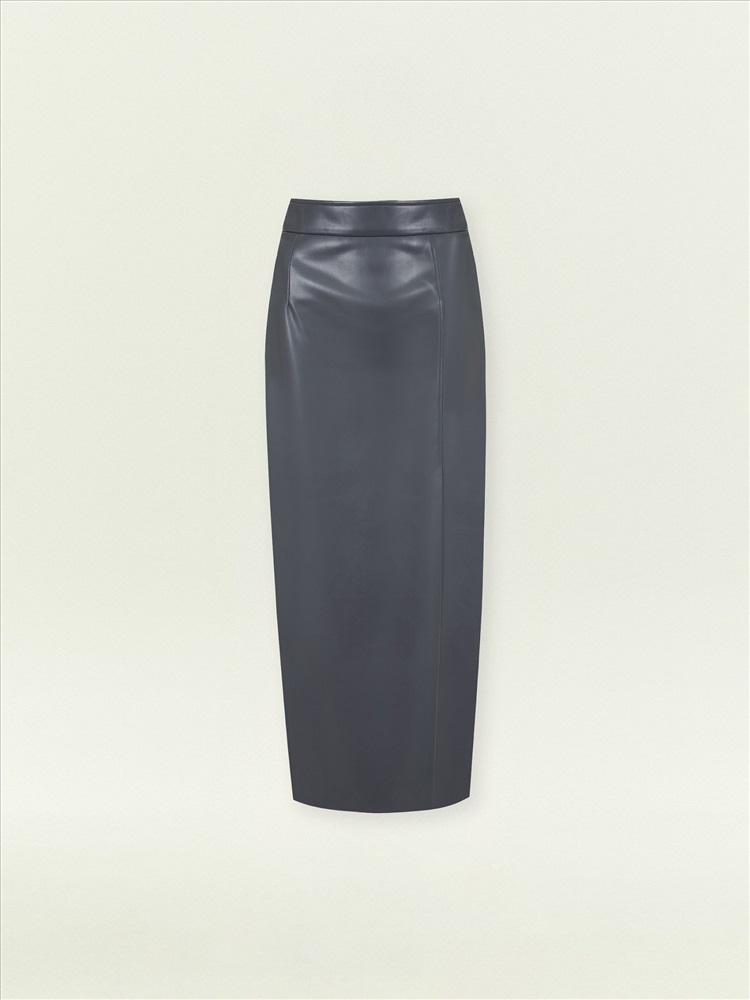 Незаменимая базовая вещь на демисезон. Юбка-карандаш выполнена из качественной экокожи, максимально приближенной по свойствам к натуральной. Практичный материал, универсальный серо-синий цвет, элегантный фасон "карандаш" с длиной ниже колена и высокой посадкой делают её отличным выбором на каждый день. Сочетается с любыми рубашками и трикотажем, а также нарядными блузами разных фактур. Модель имеет боковой разрез со шлицей. Выполнена без подкладки.