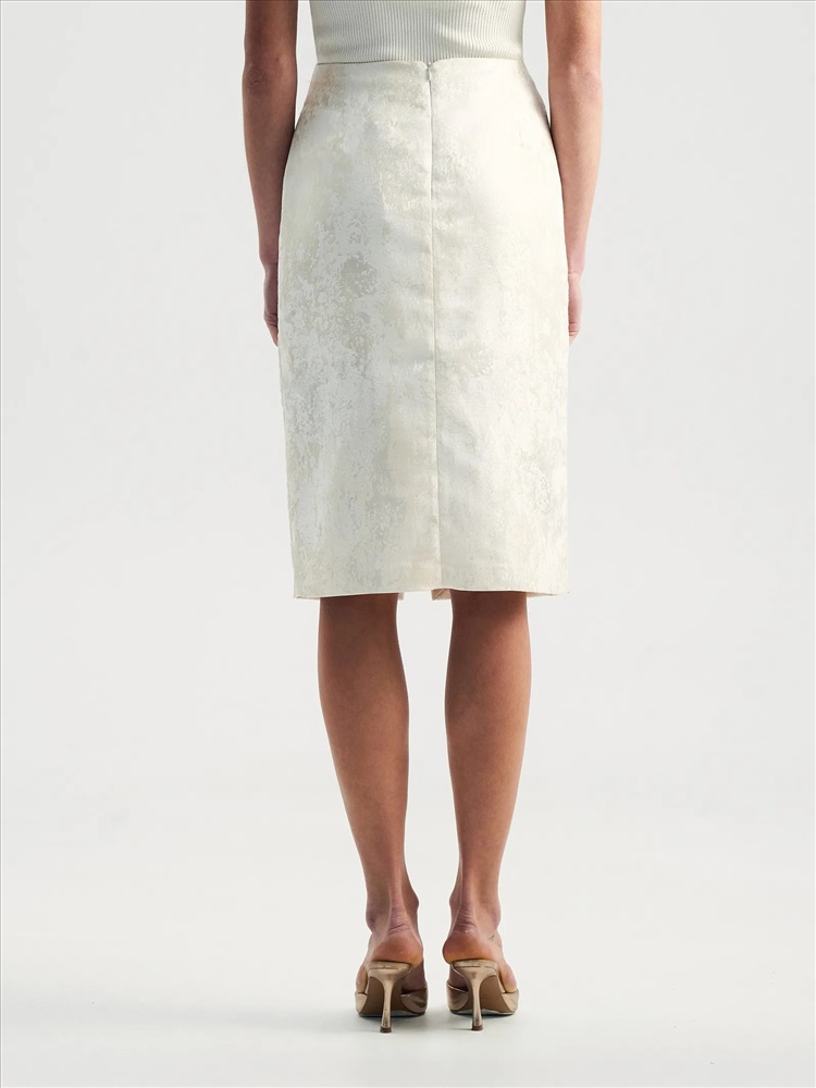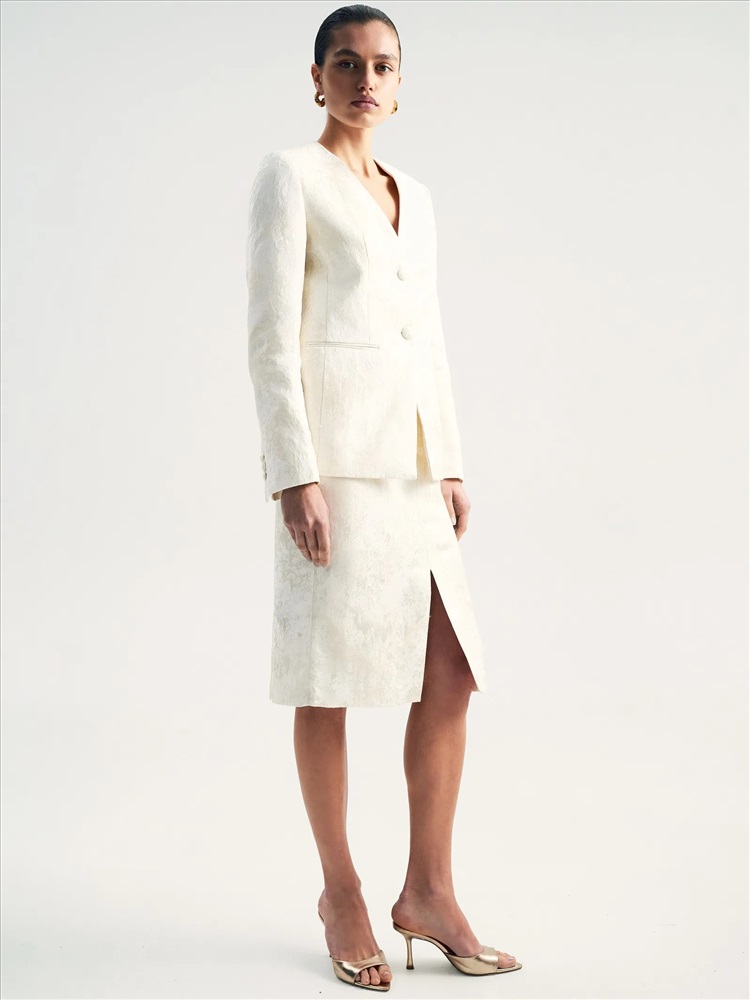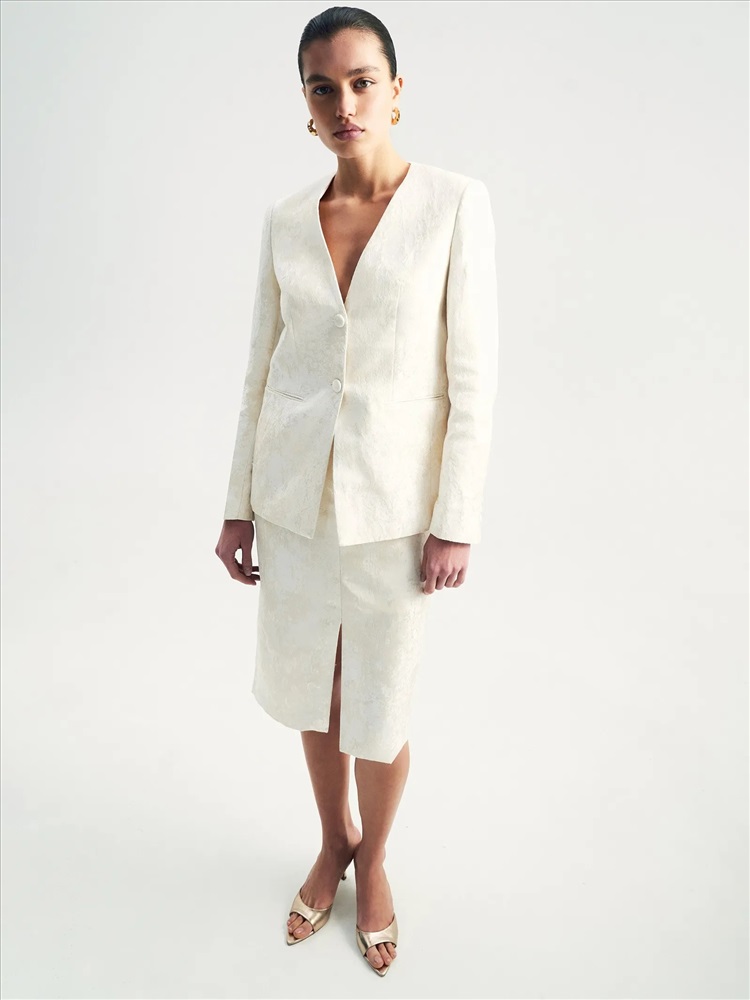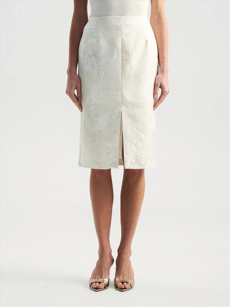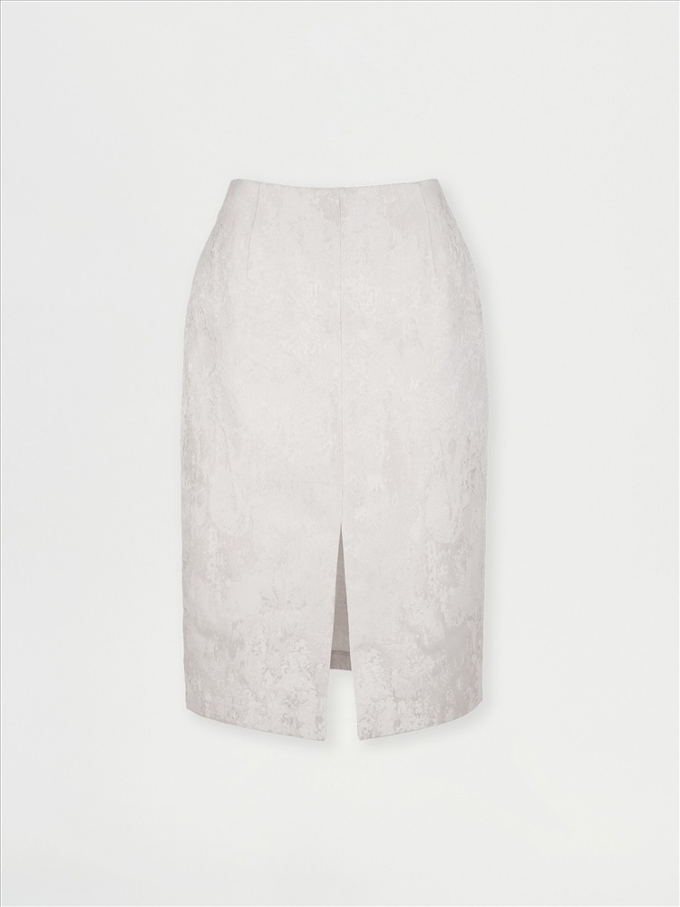 Идеальный вариант для торжественных случаев или для того, чтобы создать себе ощущение праздника каждый день. Юбка-карандаш из роскошного двухтонного жаккарда — кремовый узор на сливочном фоне. Сочетание двух оттенков молочного цвета создаёт дорогой и изысканный образ. Материал наполовину состоит из натурального хлопка. Дополняет жаккард гладкая молочная подкладка с высоким содержанием вискозы. Модель длиной чуть ниже колена имеет разрез спереди. Завершить образ с юбкой можно жакетом из комплекта.