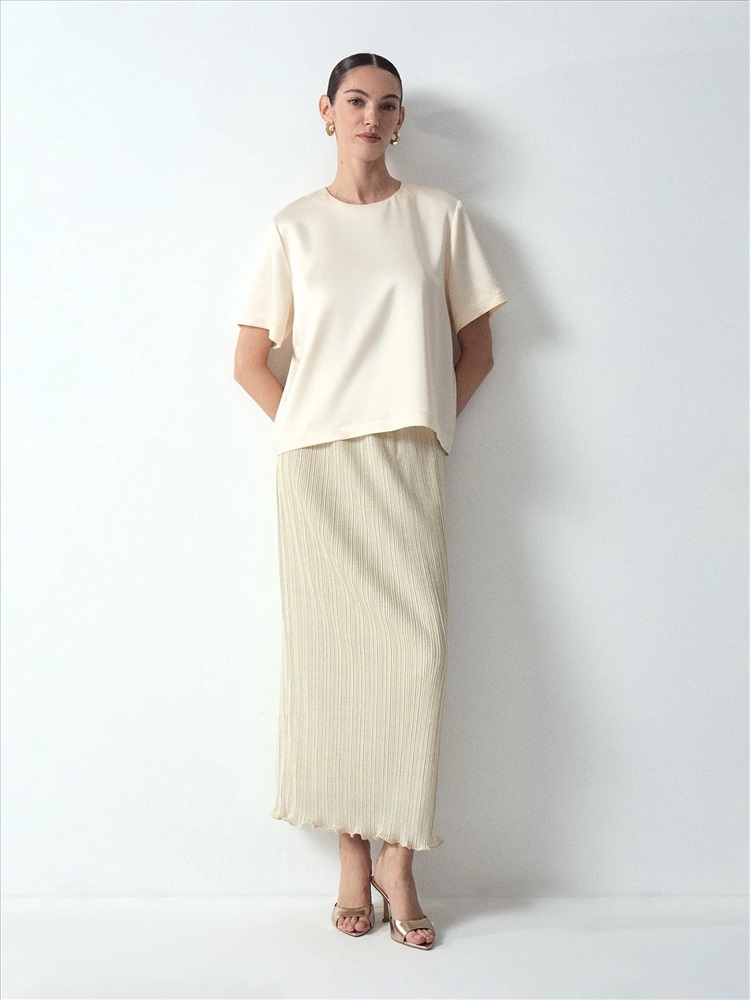 Незаменимая юбка, которую можно носить на праздники и в будни. Модель на резинке очень удобна и всегда отлично садится по фигуре. Элегантный дизайн позволяет собирать образы со множеством вариантов верха, от базовой водолазки до атласного топа или кружевного боди. Светло-бежевый материал с золотистым люрексом сочетается по цвету с верхом всех базовых расцветок и многих акцентных: золотым, мятным, сиреневым, розовым. Материал имеет тактильно интересную фактуру и хорошо проявляет себя в носке за счёт практичного состава. Юбка выполнена на подкладке.