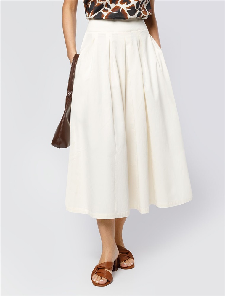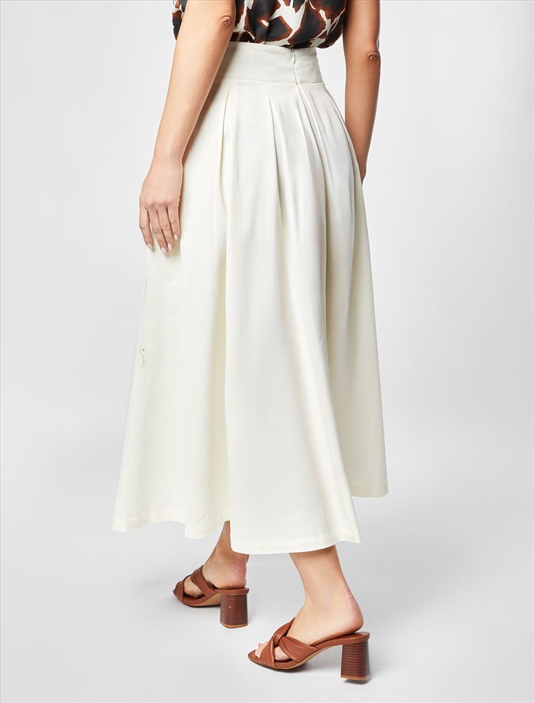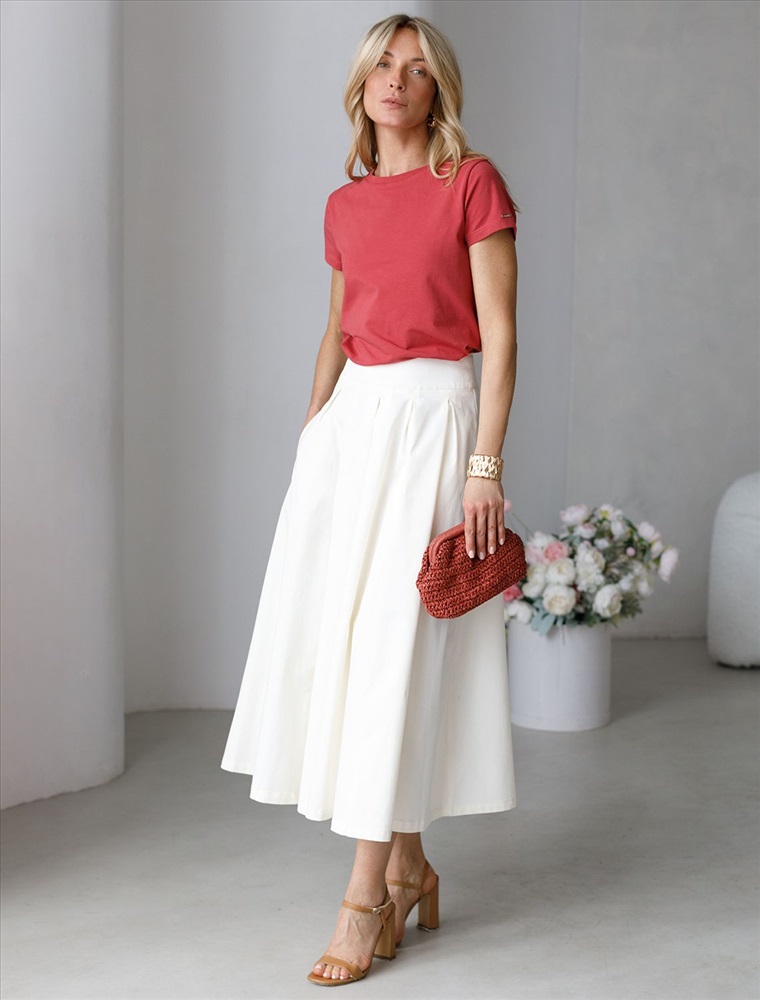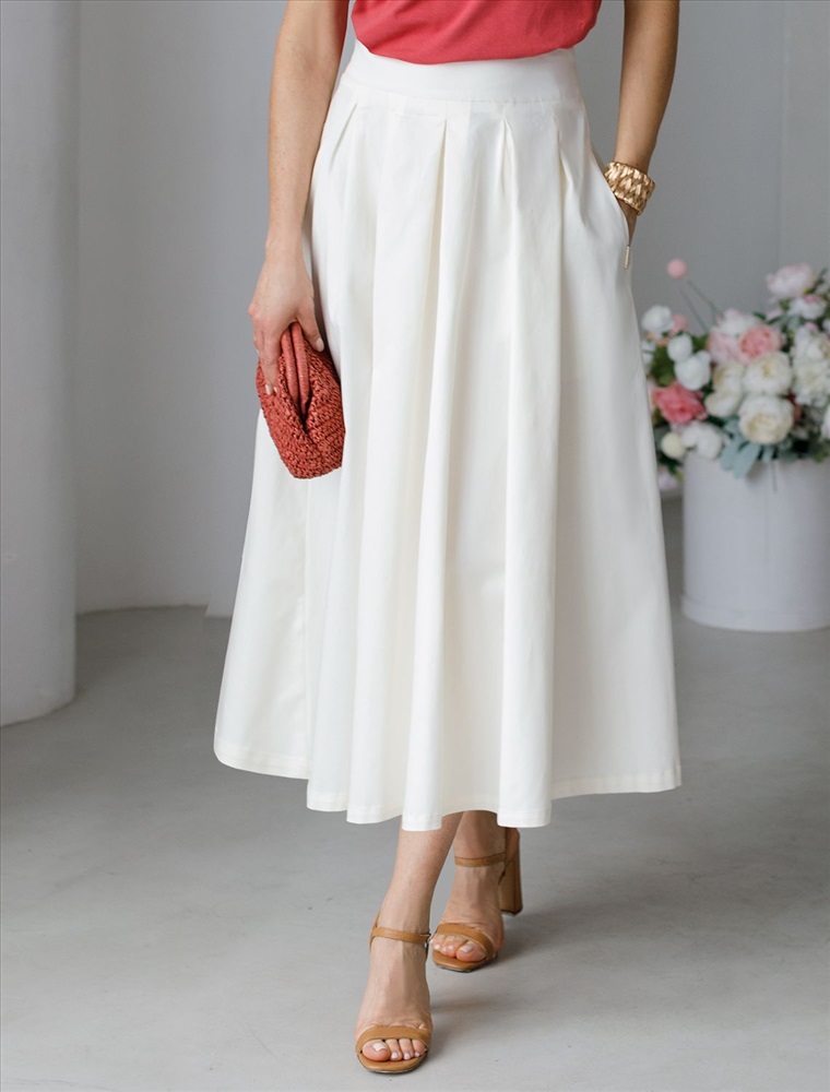Женская юбка длины миди в складку расклешенного силуэта из хлопкового твила. Модель имеет застёжку на молнию. Визуально подчеркивает талию и бедра, подходит как для повседневного гардероба, так и для особого случая. Натуральный материал ткани обеспечивает высокий уровень комфорта, отличную гигроскопичность и воздухопроницаемость. Эластан в составе изделия минимизрует деформацию модели и продлевает срок носки.