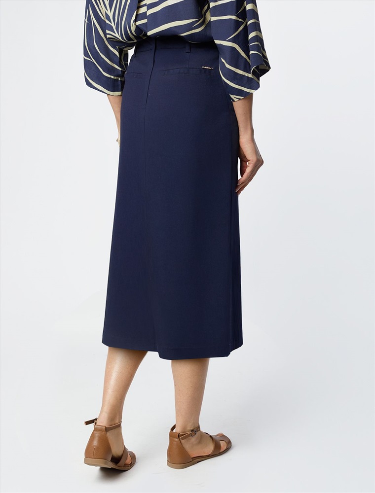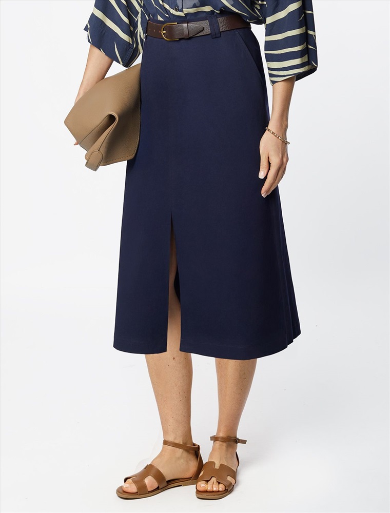 Женская юбка длины миди А-силуэта выполнена из хлопокового твила. Изделие дополнено разрезом спереди и боковыми карманами. Застежка на молнии сбоку. Отличный вариант для любого сезона, как для офисного стиля, так и для повседневного гардероба. Натуральный материал ткани обеспечивает высокий уровень комфорта, отличную гигроскопичность и воздухопроницаемость. Эластан в составе изделия минимизрует деформацию модели и продлевает срок носки.