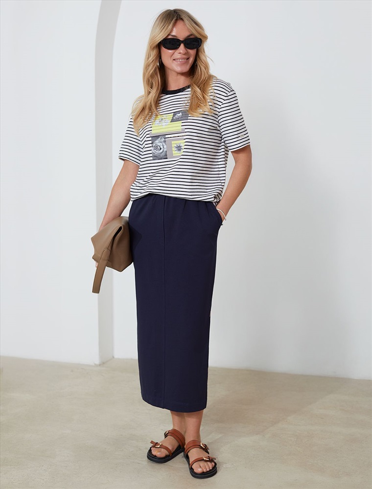 Юбка миди темно-синего цвета выполнена из футера двухнитки с эластаном плотностью 240 Г/м2. Плотная структура материала отлично держит форму, не вытягивается и обеспечивает оптимальный теплообмен. В этой юбке из нежного и тактильно приятного трикотажа не жарко летом и уютно в весенннюю погоду. Гладкая лицевая сторона придает юбке опрятный и дорогой вид. Универсальная длина миди визуально вытягивает силуэт, делает образ более сдержанным и подходит на низкий и высокий рост. Эластичный широкий пояс на резинке мягко фиксирует юбку на талии, обеспечивая идеальную посадку на любую фигуру, в том числе большие размеры, включая 56. Боковые карманы добавляют функциональности и подчеркивают расслабленный характер повседневной юбки, а разрезы по бокам добавляют образу динамики и легкости. Спортивная юбка средней длины позволяет чувствовать себя максимально расслабленно, при этом сохраняя изящный женственный образ. Поможет при создании стиля casual и подойдет для более утонченного лука.