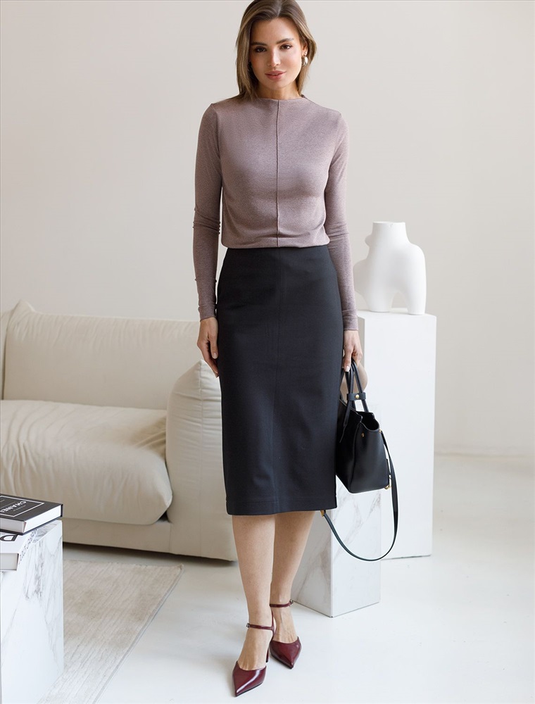 Плотность: 390 Г/м2 Юбка прямого кроя выполнена из плотного формоустойчивого джерси - плотность 450г/м2. Застежка на молнию и потайную пуговицу. Изделие дополнено высоким разрезом сзади и декоративным швом спереди. Изделие хорошо держит форму, отлично тянется и почти не мнется во время использования. Идеальный вариант в офис или в повседневный классический стиль. Комментарии к товару