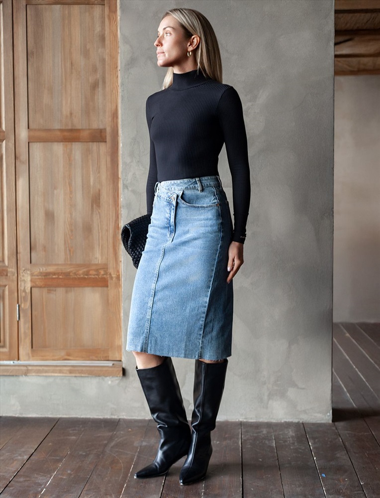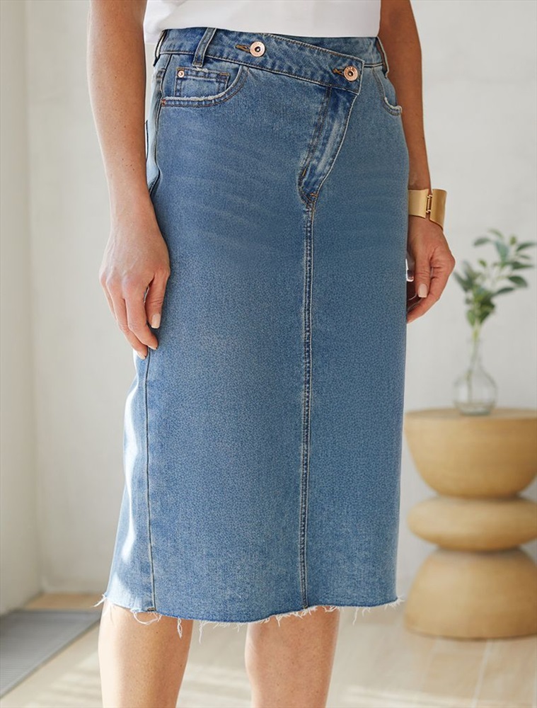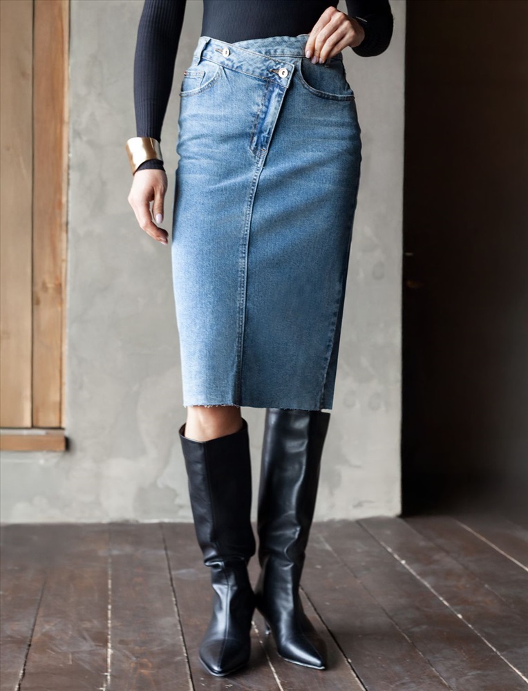 Юбка выполнена из эластичного денима. Модель с трендовой ассиметричной застежкой и декоративной стиркой дополнена краем с открытым срезом и потертостями. Изделие прямого кроя длиной чуть ниже колен с разрезом сзади дополнено брендированным патчем и высококачественной фурнитурой.
