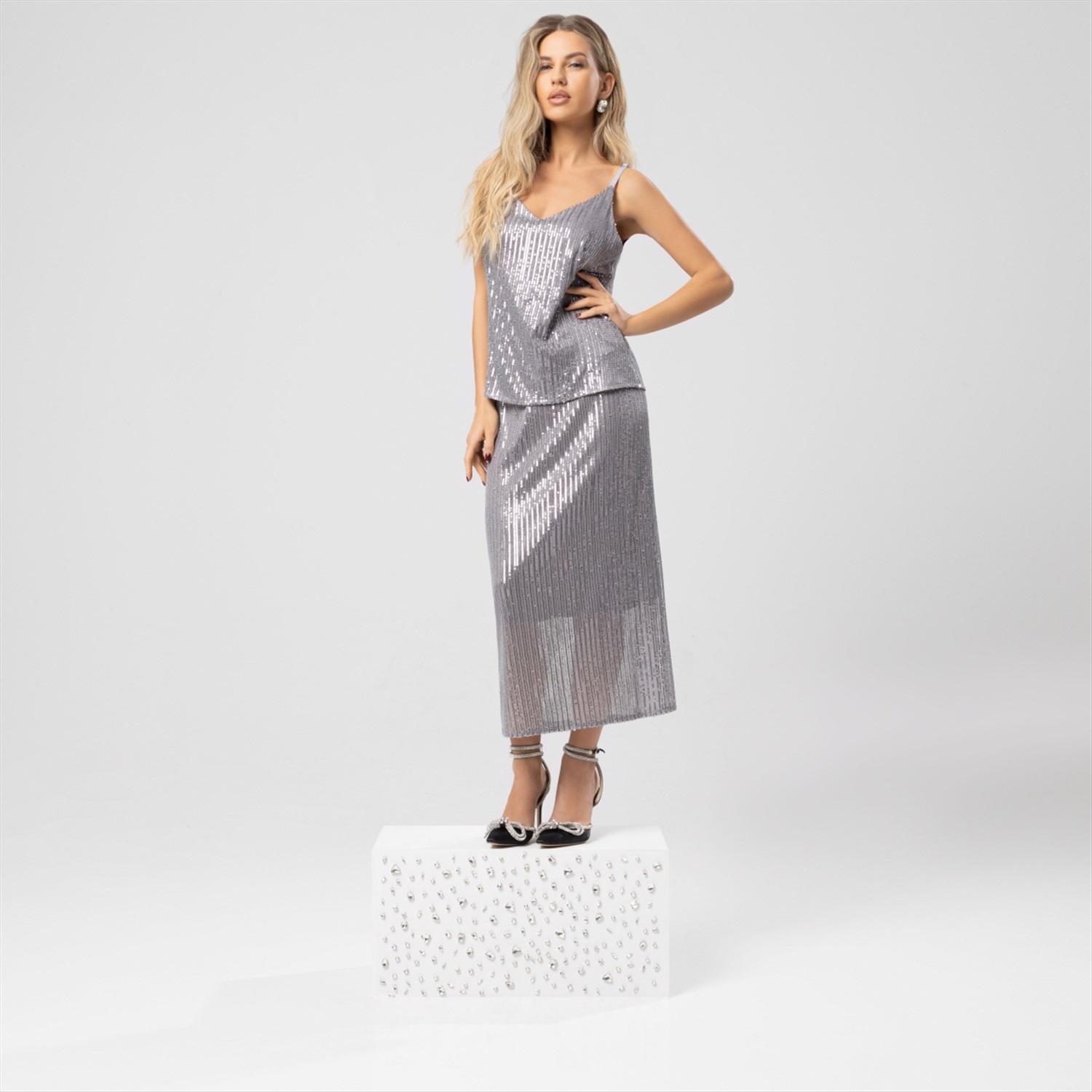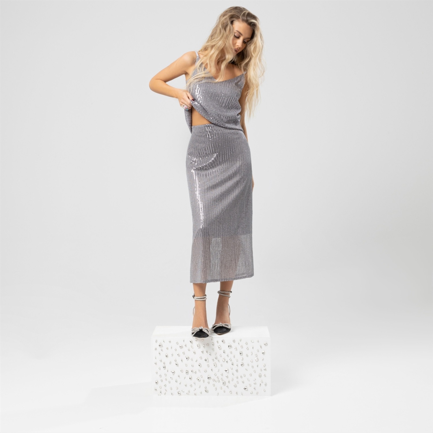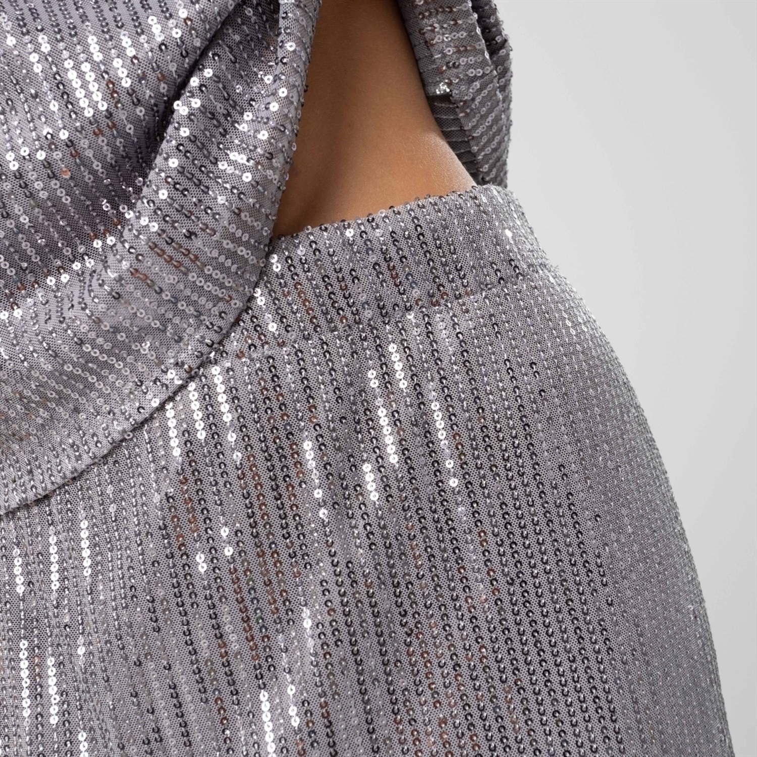 Состав: «Пайетка на сетке стрейч» (94% полиэстер, 6% спандекс) Плотность ткани: Средняя Тип ткани: Трикотаж Вид застежки: Нет Карманы: Нет Основной цвет ткани: Серебряный Отрезная талия: Нет Подклад: Есть Резинка по талии: Есть Рисунок/раппорт: Нет, все изделия идентичны Сезон: Круглогодичный Силуэт: Свободный Стиль: Нарядный Фасон юбки: Прямая Фасон юбки: Прямая Параметры модели на фото: