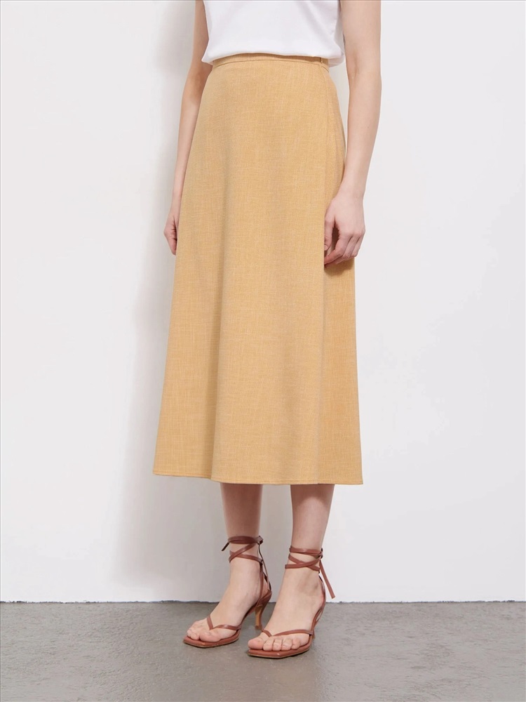Юбка жёлтого цвета в мелкую гусиную лапку. Выполнена из фактурного материала с высоким содержанием вискозы, на подкладке. Модель А-силуэта в длине миди имеет высокую посадку. Сочетается с трикотажными футболками и топами, а также другими элементами базового гардероба.