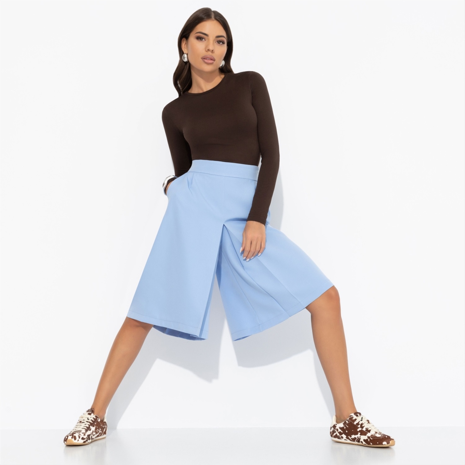 Состав: Костюмная ткань «барби» (95% п/а, 5% эластан) Плотность ткани: Средняя Тип ткани: Текстиль Вид застежки: Пуговица/-ы, молния Высота посадки: Средняя Карманы: В боковом шве Основной цвет ткани: Голубой Отрезная талия: Есть Подклад: Нет Резинка по талии: Нет Рисунок/раппорт: Нет, все изделия идентичны Сезон: Круглогодичный Силуэт: Свободный Стиль: Классический Фасон юбки: Юбка-шорты Фасон юбки: Юбка-шорты Параметры модели на фото: