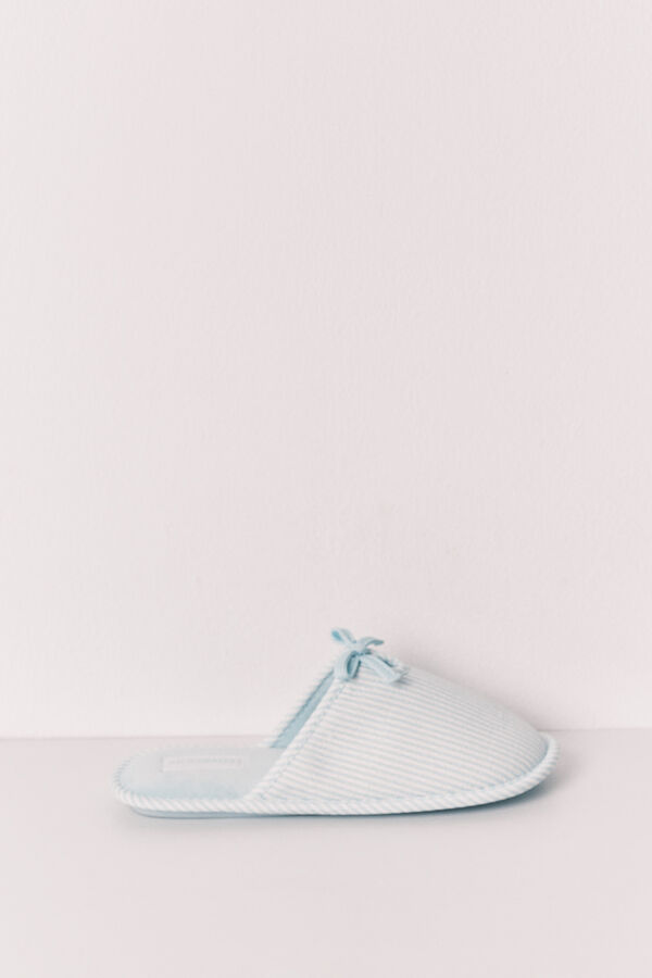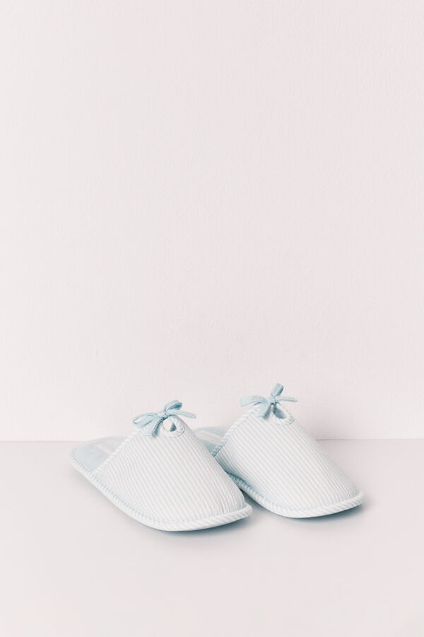 Zapatillas de estar en casa tipo slippers, de color verde con estampado de rayas y detalle de lazo en el empeine. Ideales para llevar a juego con su pijama.