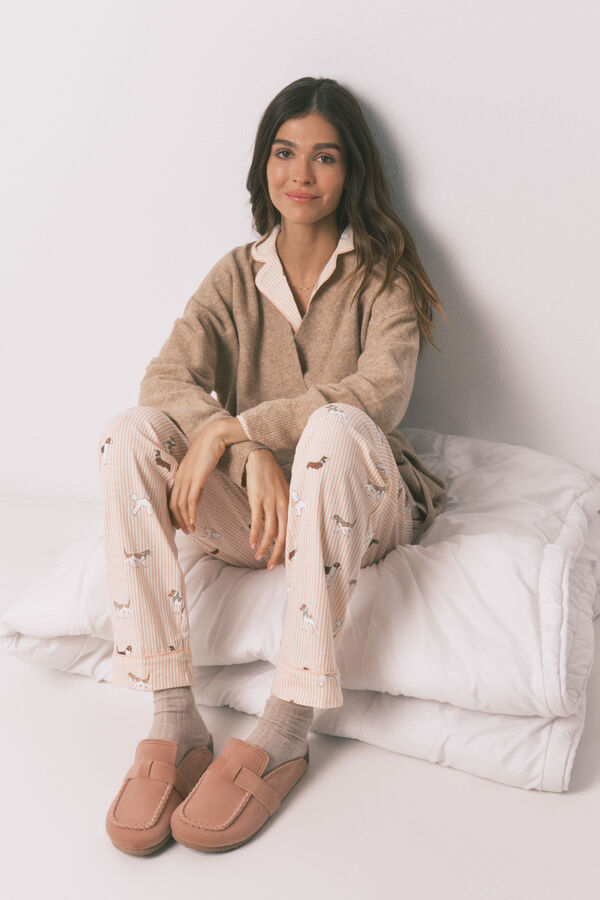 Zapatillas de estar en casa tipo bio, con el exterior de efecto ante y el interior forrado en borreguito. Llévalas a juego con un pijama de la colección.