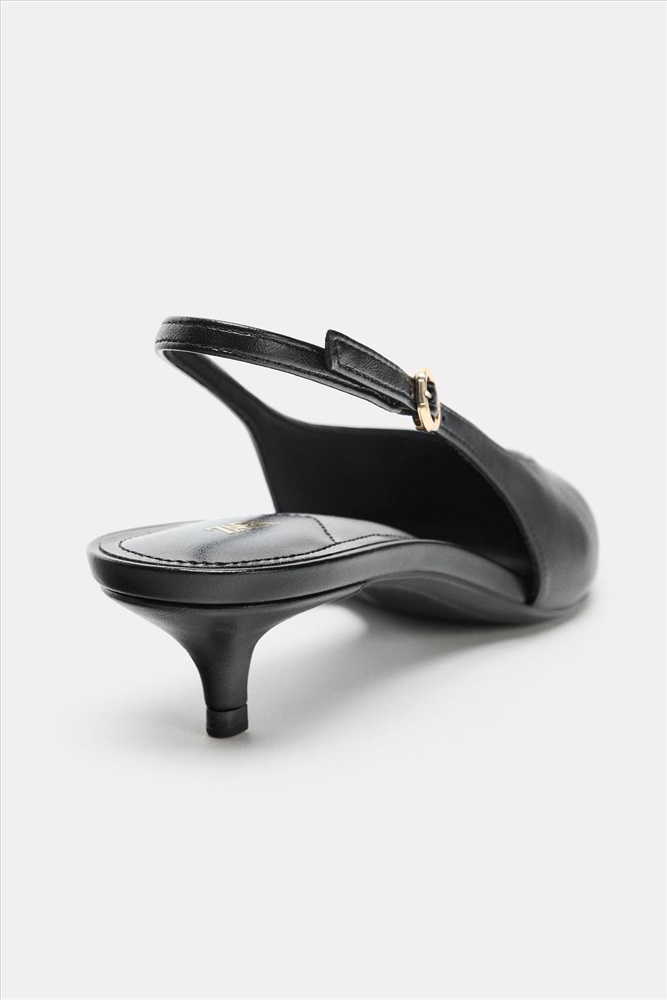 Slingback heeled shoes. Topstitching detail on the front. Back strap with adjustable buckle and elastic. Stiletto kitten heel. V-cut vamp. Pointed toe.