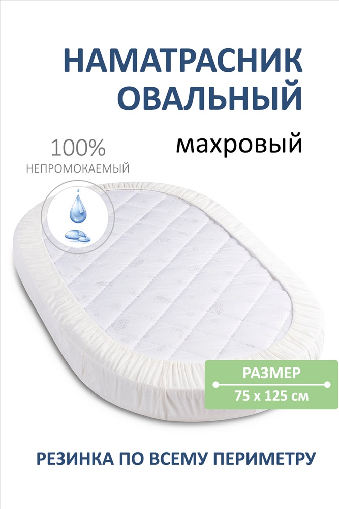 Сезонность: лето | осень | весна | зима Детский овальный наматрасник непромокаемый 75х120 на резинке по всему периметру. Изготовлен из махрового полотна с мембранным покрытием (мулетон Aquastop). Борта шириной 15 см изготовлены из мулетона Aquastop. Водонепроницаемый чехол на матрас защищает матрас от влаги и грязи, а постельное белье на нем не скользит. Для более надежной фиксации мы используем резинку, прошитую усиленным швом. Прост в уходе и быстро сохнет, рекомендуемая температура стирки до 30 градусов. Наматрасник аквастоп 75х120 может быть использован как непромокаемая простынь, его дышащая махровая поверхность приятна к телу и гипоаллергенна. Отлично подходит для детской кроватки.
