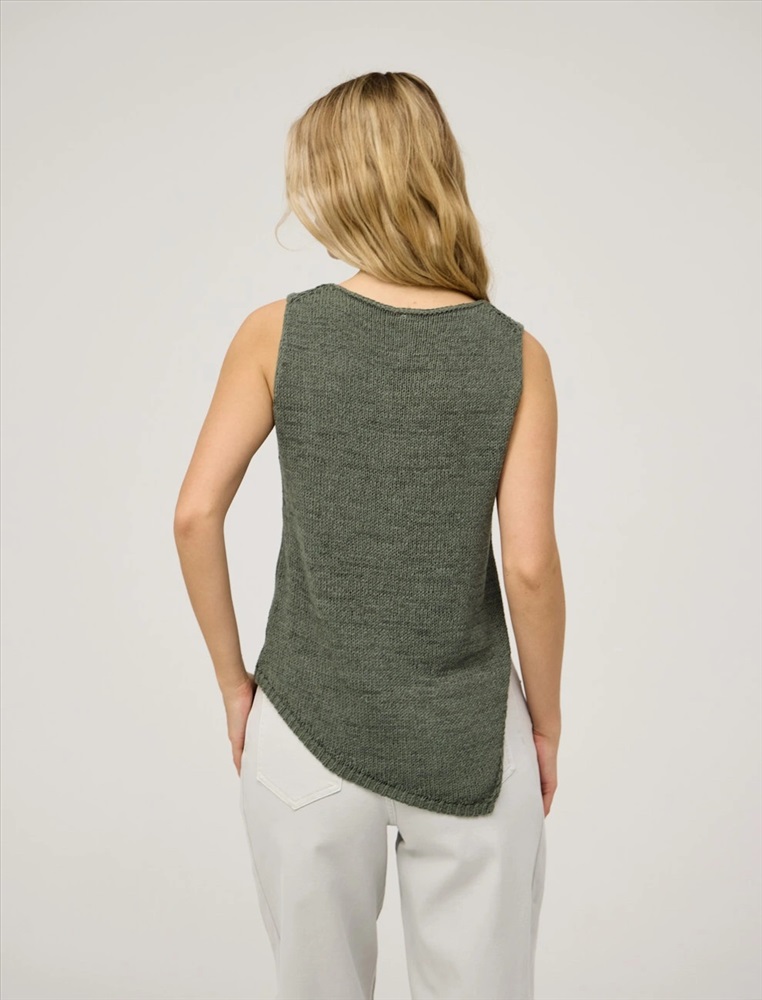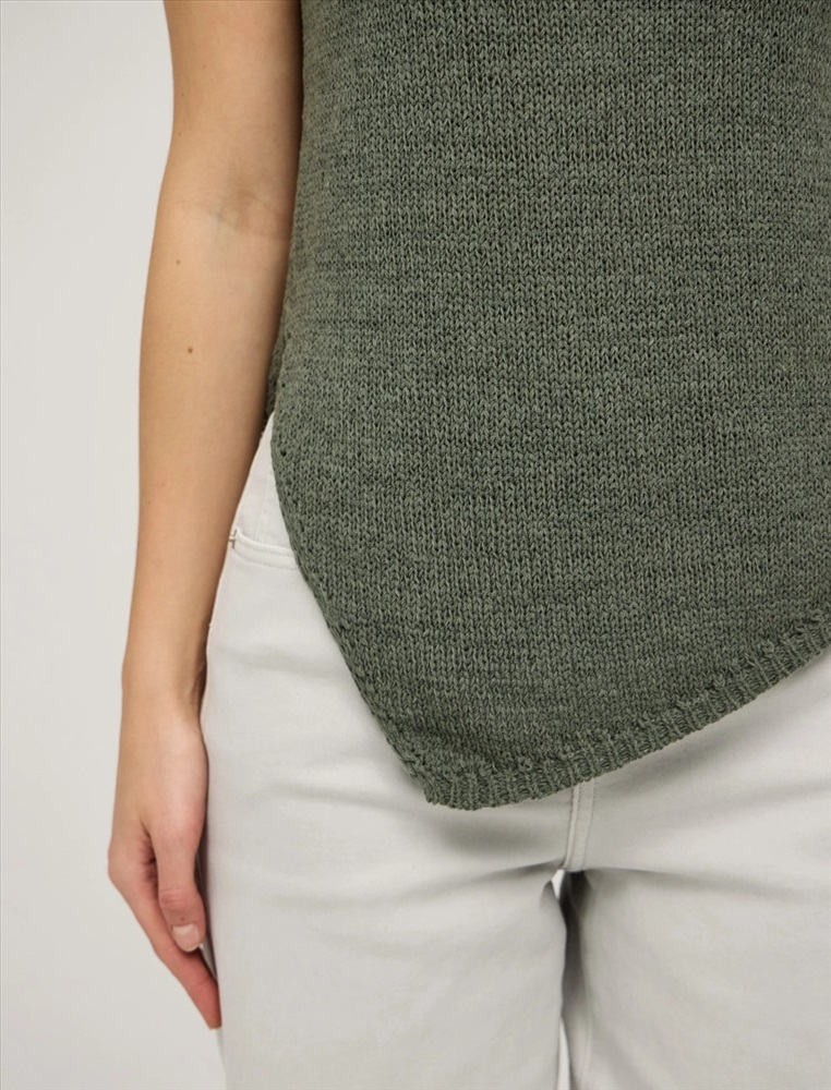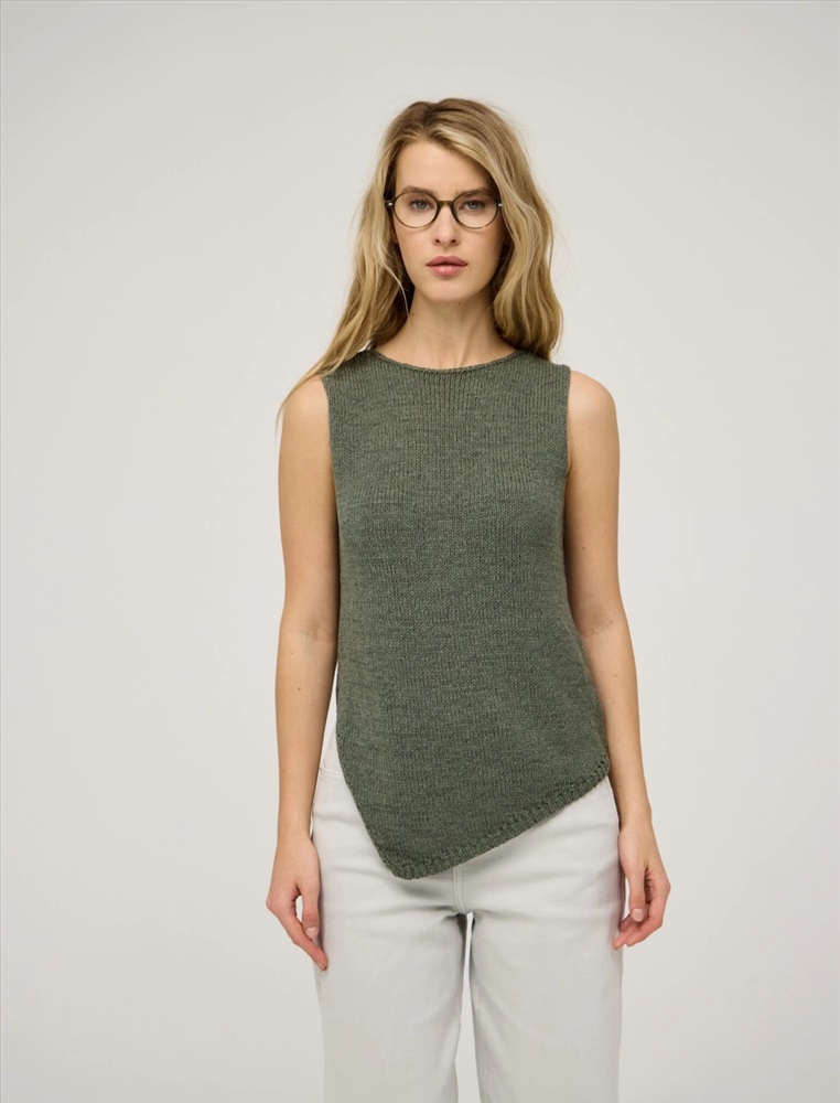 Вязаная блузка прямого силуэта без рукавов, с горловиной-лодочкой и асимметричным низом. Выполнена из хлопка, тенсела и льна, обеспечивающих прохладу в знойную жару. Представлена в зеленом цвете.