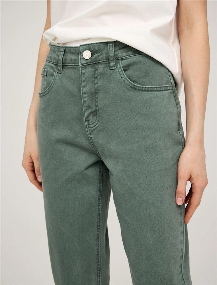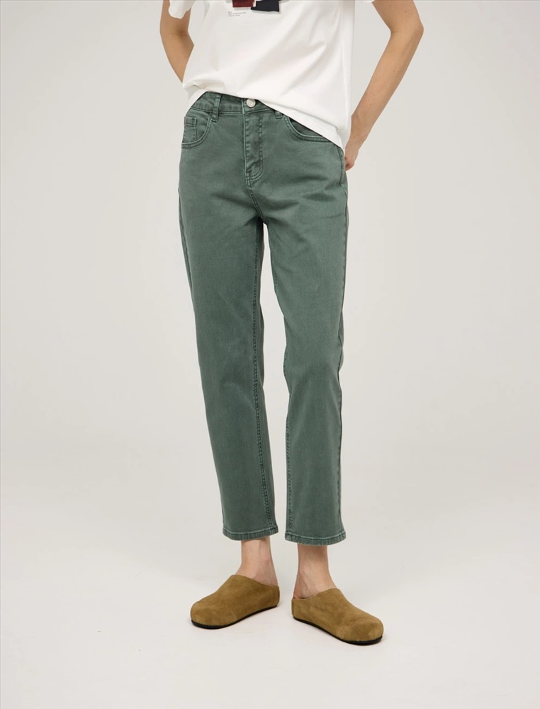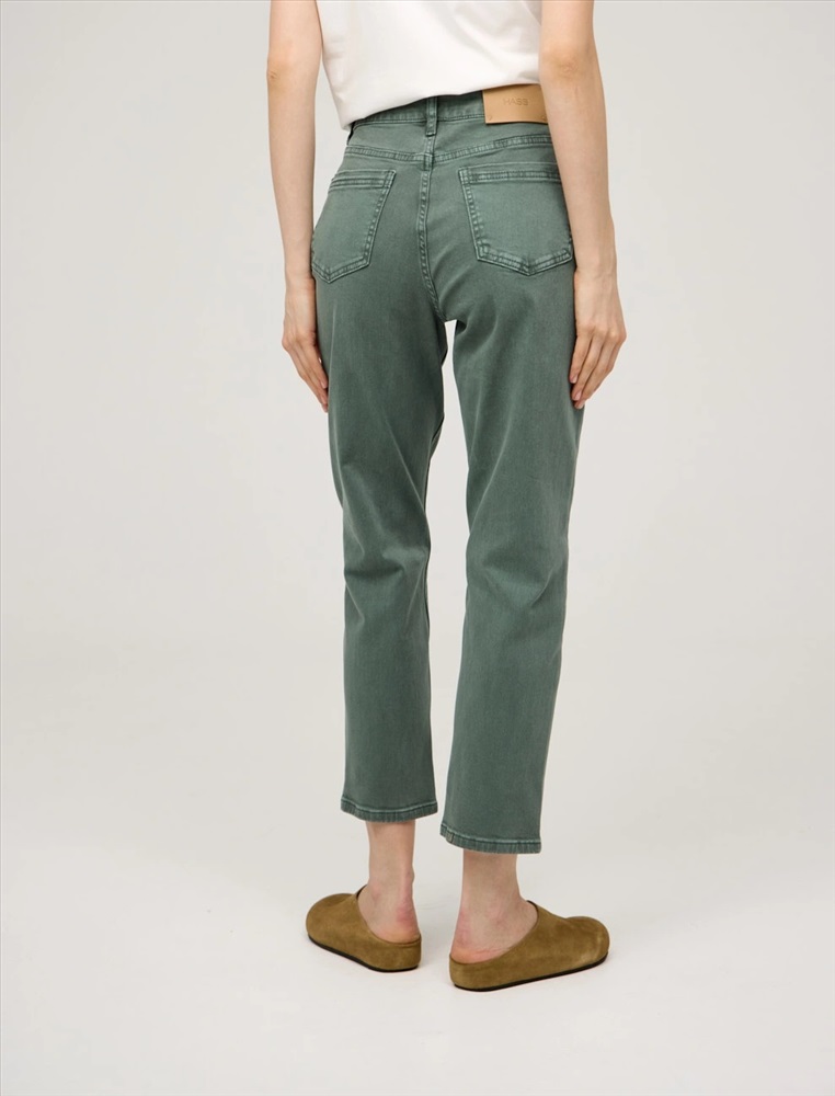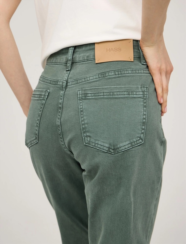 Джинсы зауженного к низу силуэта, укороченные, с посадкой на уровне талии. По поясу шлевки для ремня. По передней части изделия – классический гульфик, застежка на пуговицу и три кармана. Сзади кокетка, накладные карманы и брендированный патч HASS. Акцентной деталью изделия является мягкая равномерная варка. Выполнены из хлопка с добавлением спандекса, что обеспечивает комфорт и долговечность. Представлены в светло-сером и зеленом оттенках.