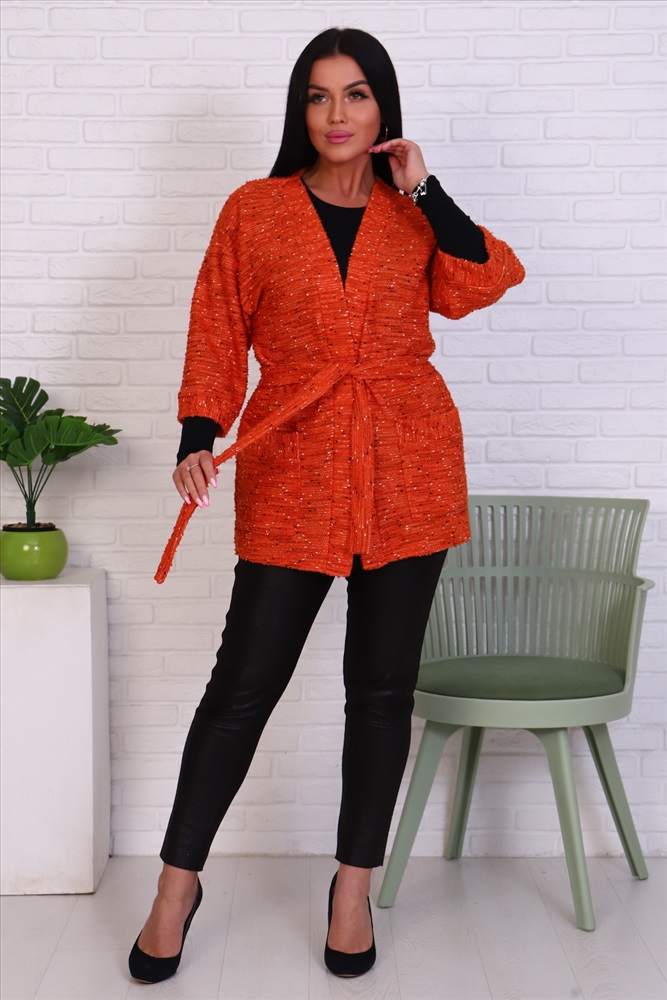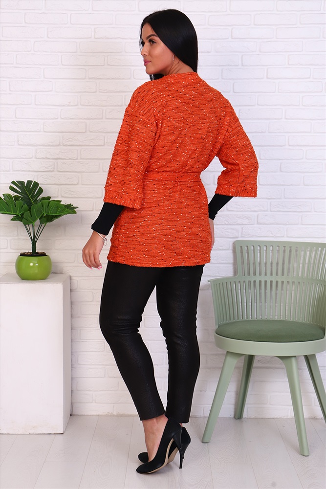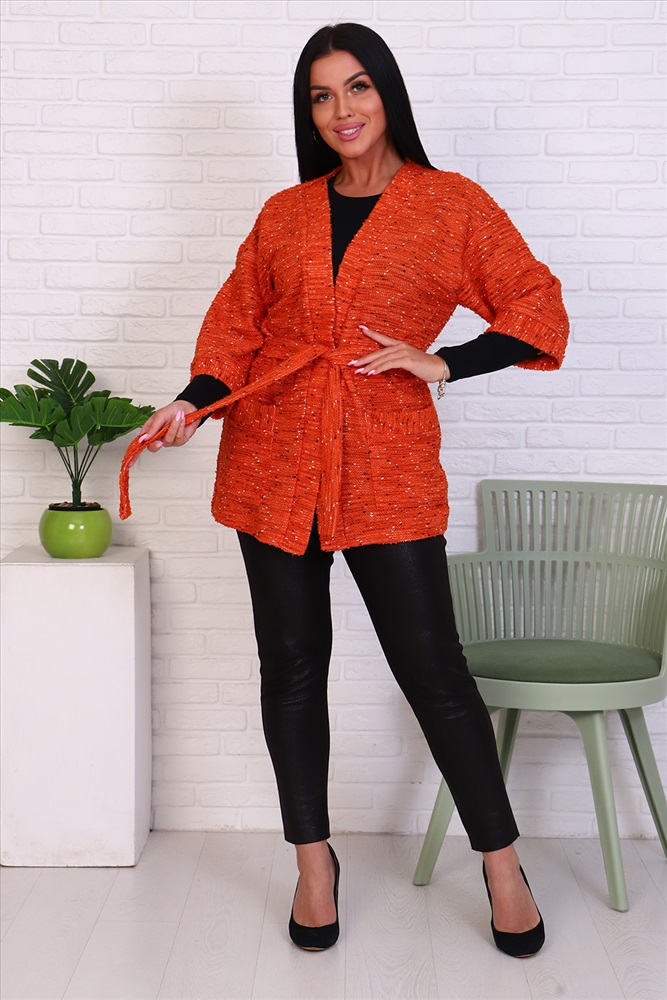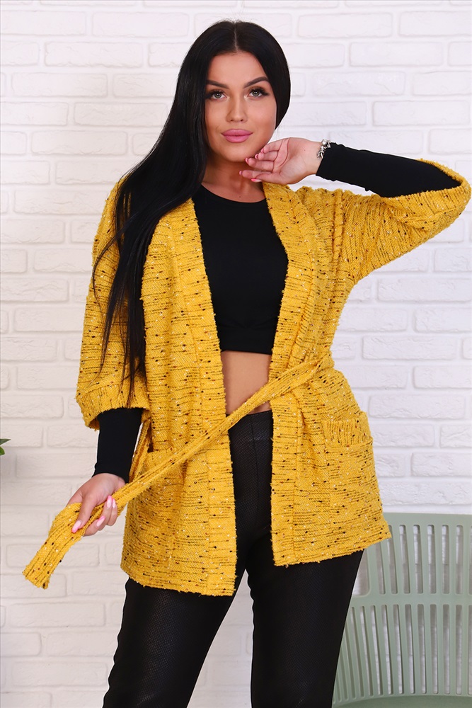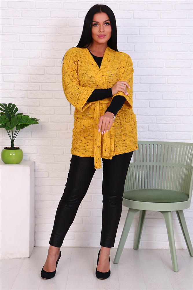 Застежка: на запах | пояс Стильный жакет из мягкого трикотажа БУКЛЕ с цветными вкраплениями. Модель свободного кроя с глубоким вырезом, передние полочки, накладные карманы и рукав гармонично оформлены широкой планкой, его можно носить как с поясом? так и без него. Жакет - это незаменимая вещь в гардеробе каждой современной девушки. Его простой крой, необычный, универсальный дизайн и удобный фасон не обойдут ни одну модницу стороной. Трикотаж БУКЛЕ приятный к телу, не колется.