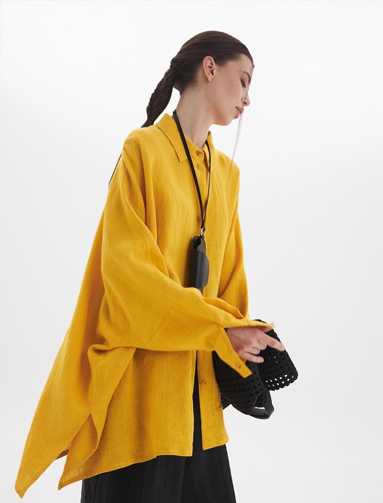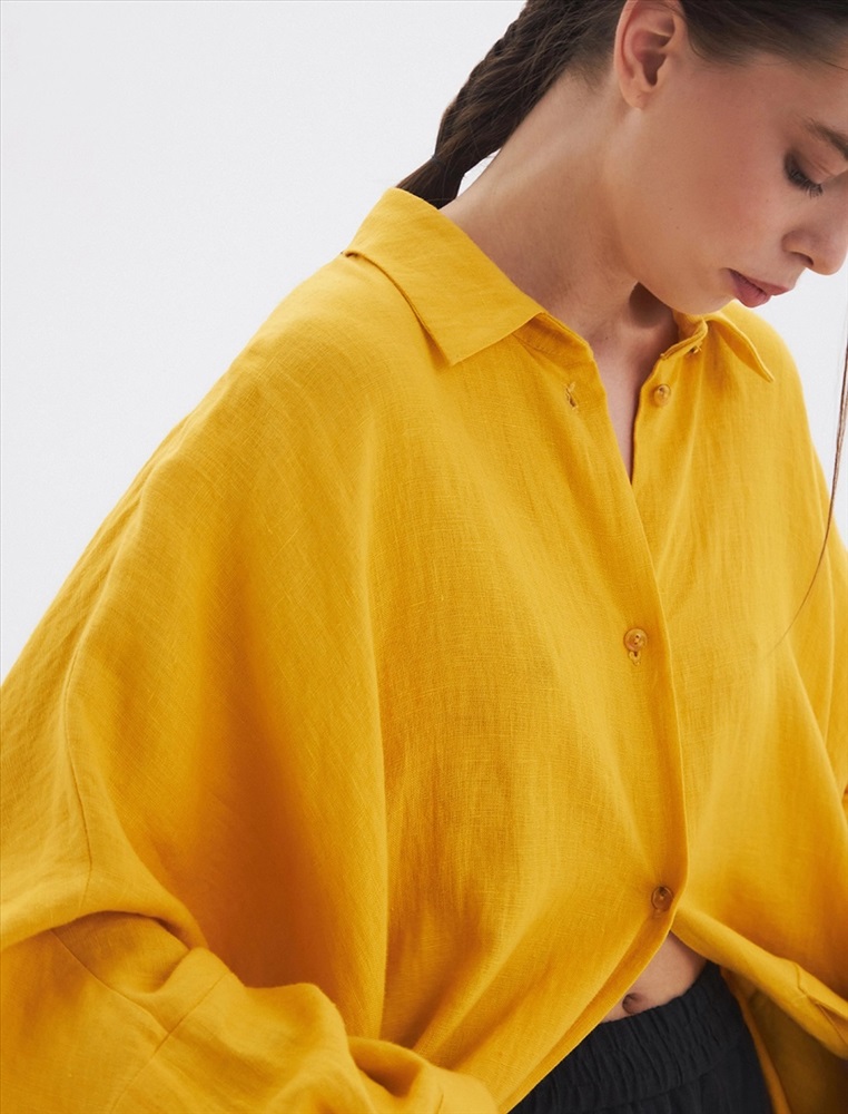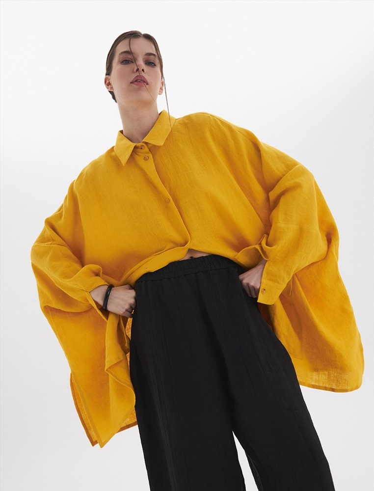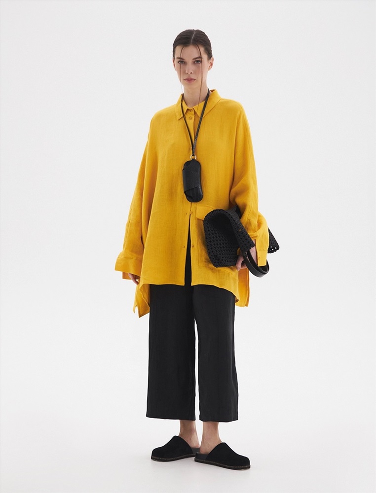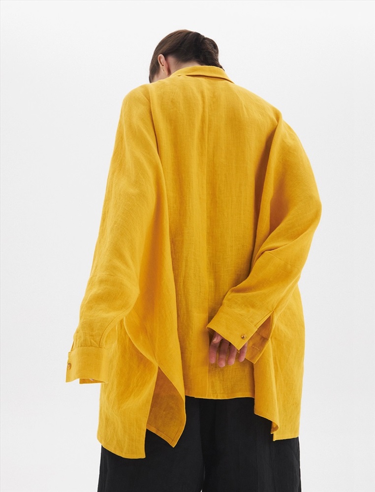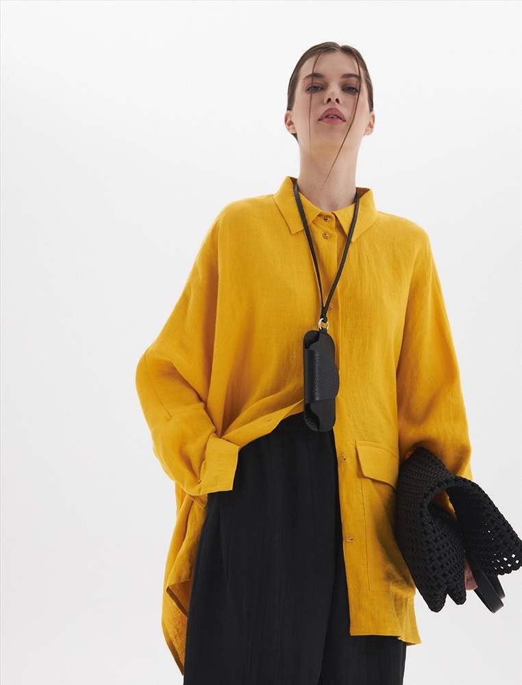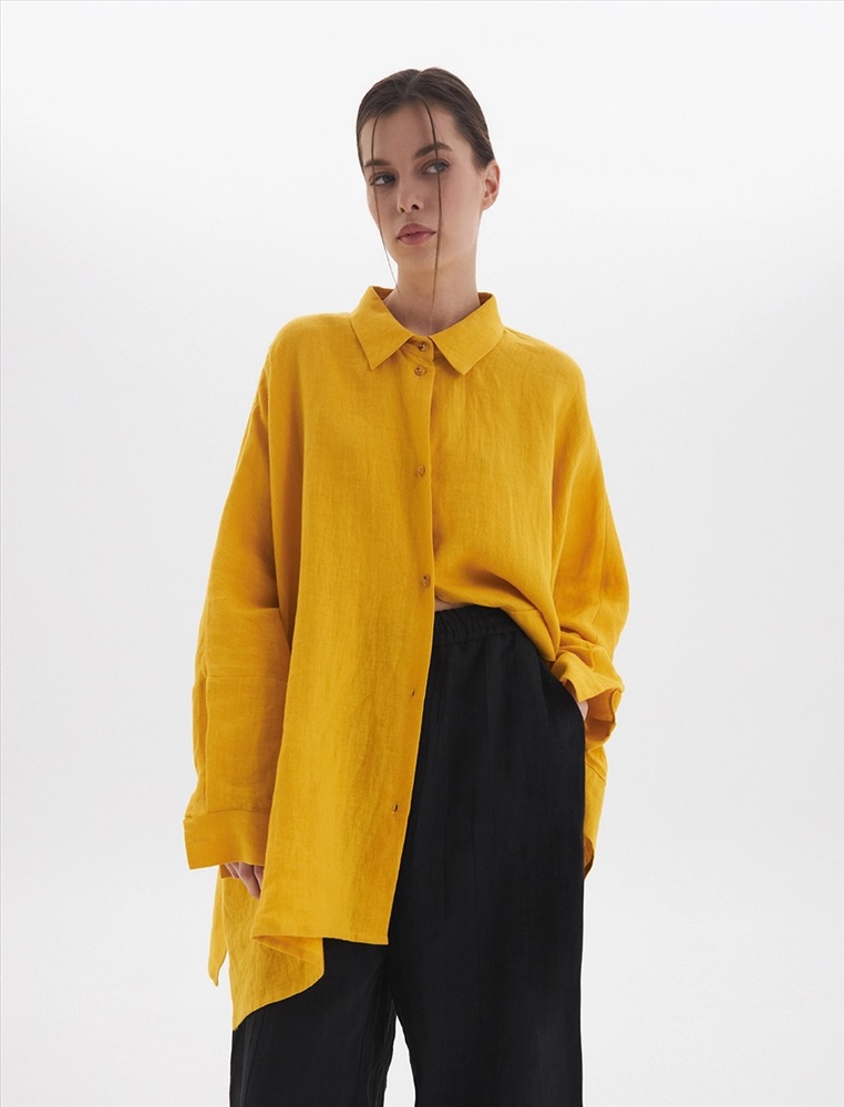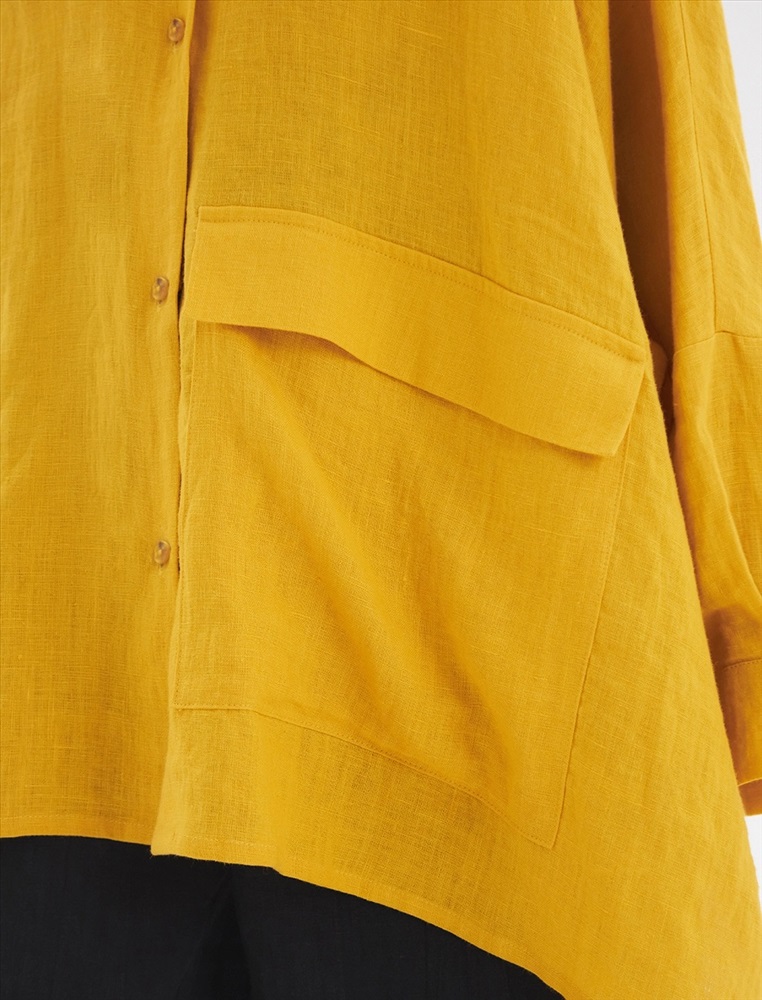 Жакет-рубашка оверсайз силуэта с низкой линией плеча. По передней части изделия воротник со стойкой и застежка на пуговицы. Слева большой карман с клапаном. Представлен в двух цветах. Изготовлен из 100% льна. Подойдет как для вечера, так и для прогулки.