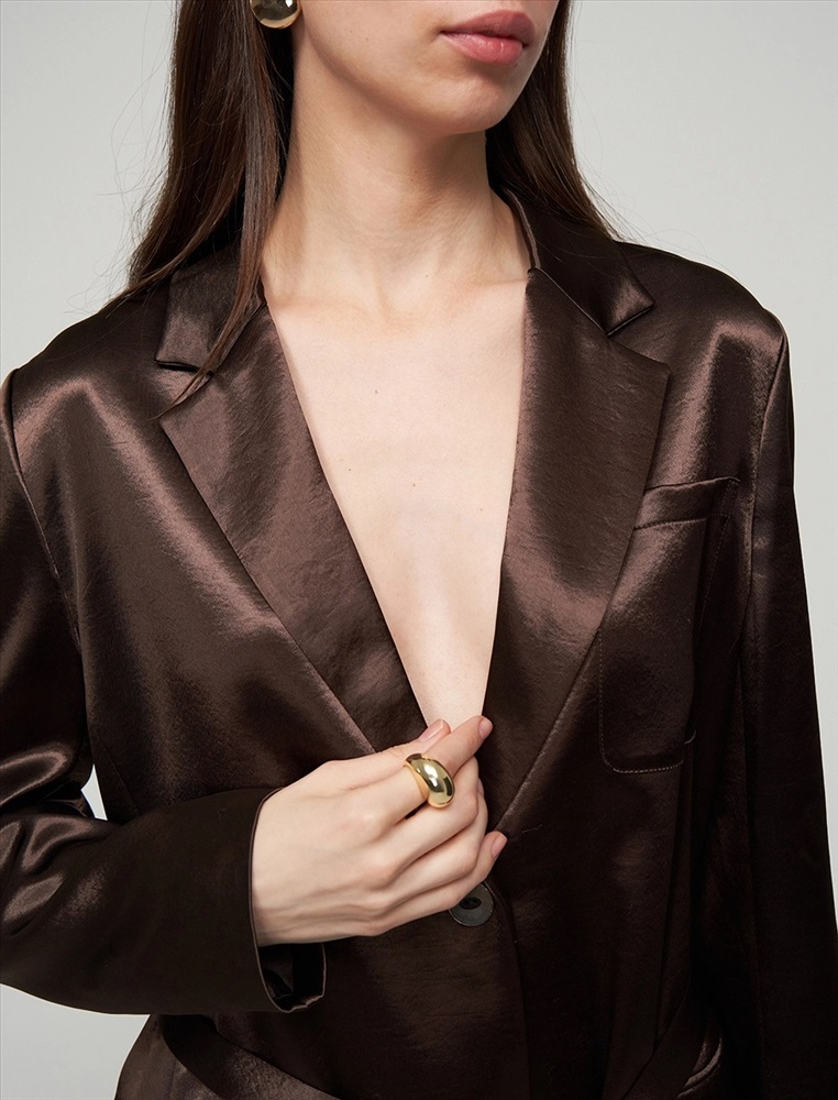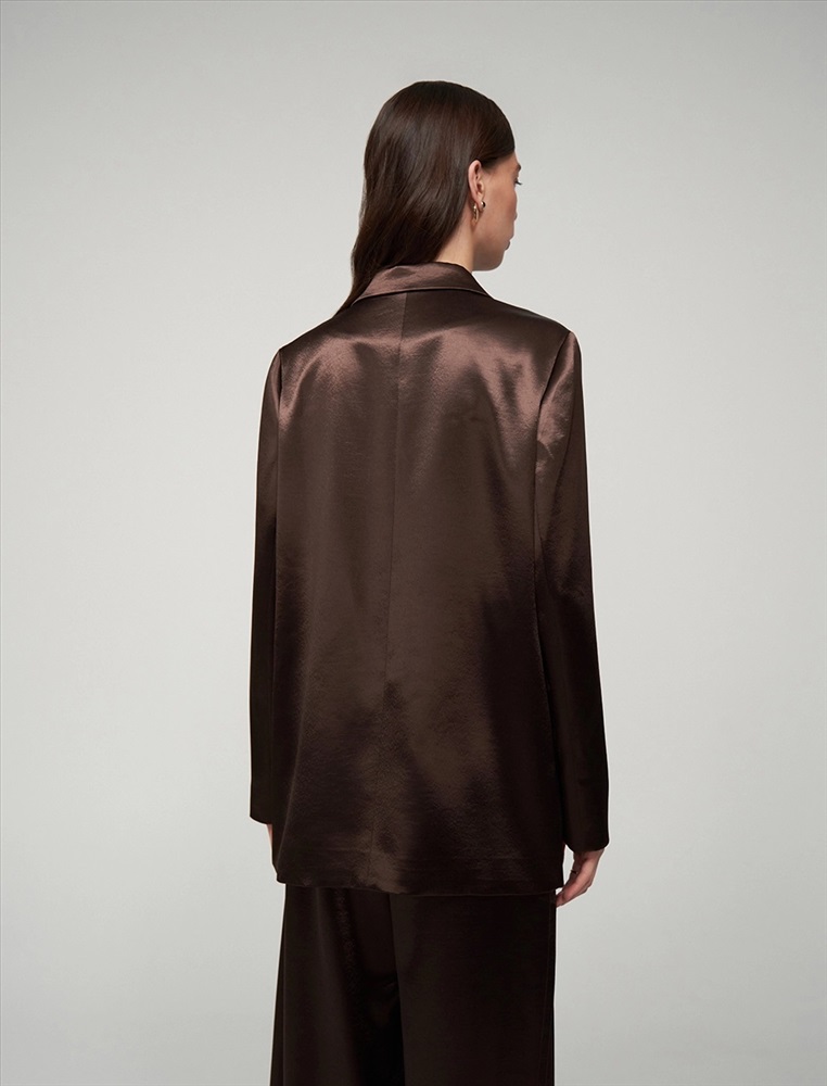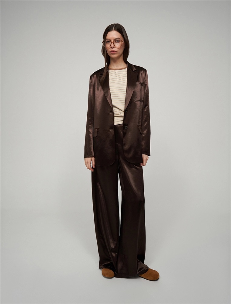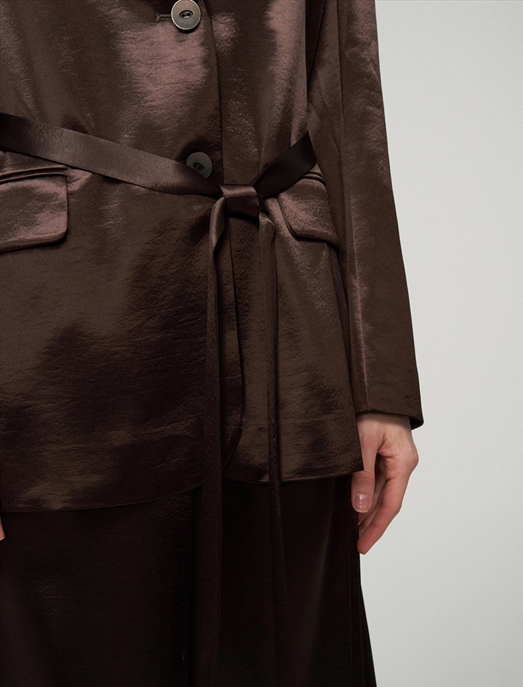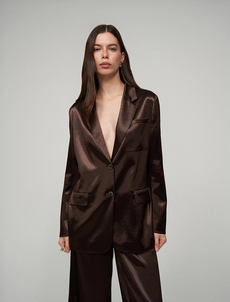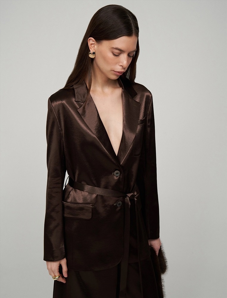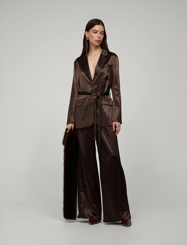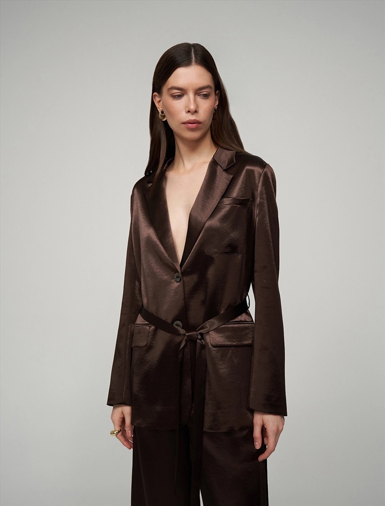 Видео: https-//hassfashion.ru/upload/iblock/d1d/z57d6fsv3lduxo5ozz04uozs3rfxvie9.mp4 осень-зима А: 82% Полиэстер,15% Вискоза, 3% Шелк; В: 95% Полиэстер, 5% Спандекс; Однобортный жакет прямого силуэта. По передней части изделия — лацканы, нагрудный накладной карман и два кармана с клапанами. В комплекте к жакету идет пояс. Выполнен из полиэстера (82%), вискозы и шелка, что позволяет сохранять гладкий, глянцевый вид и эффект жидкого металла. Представлен в коричневом оттенке.