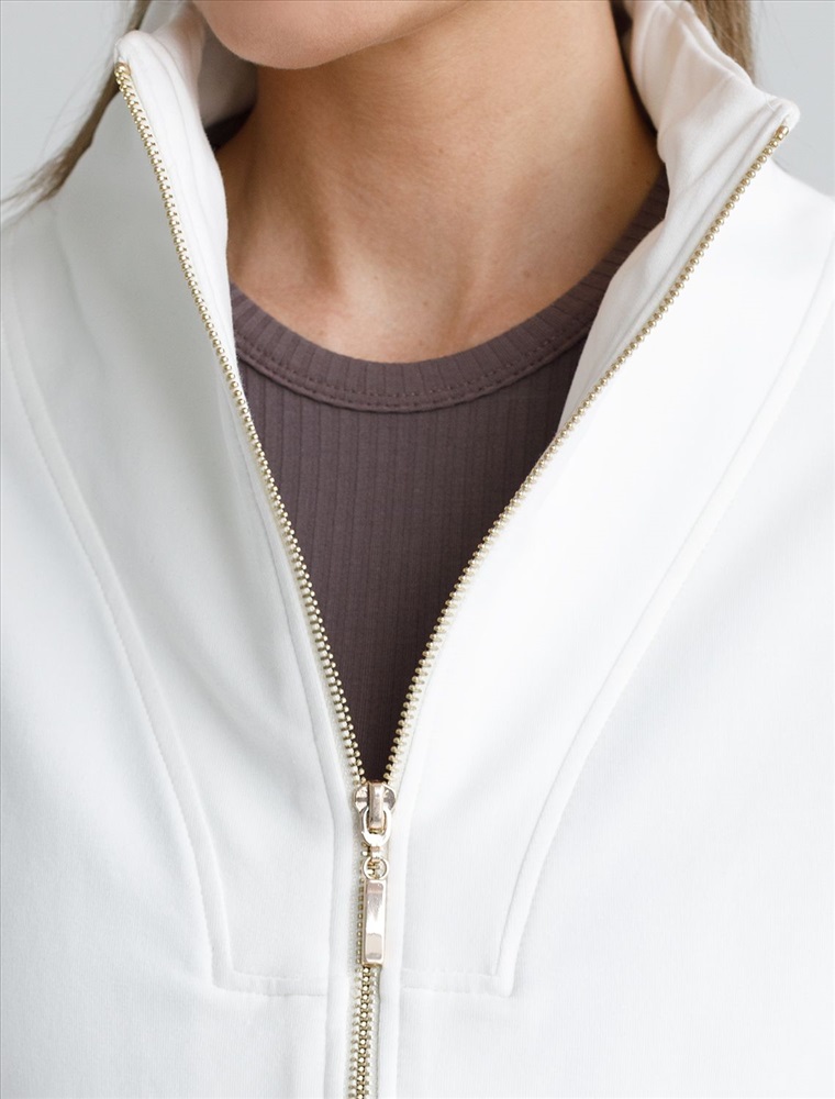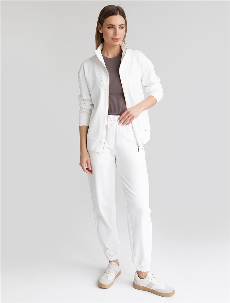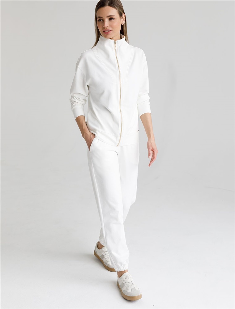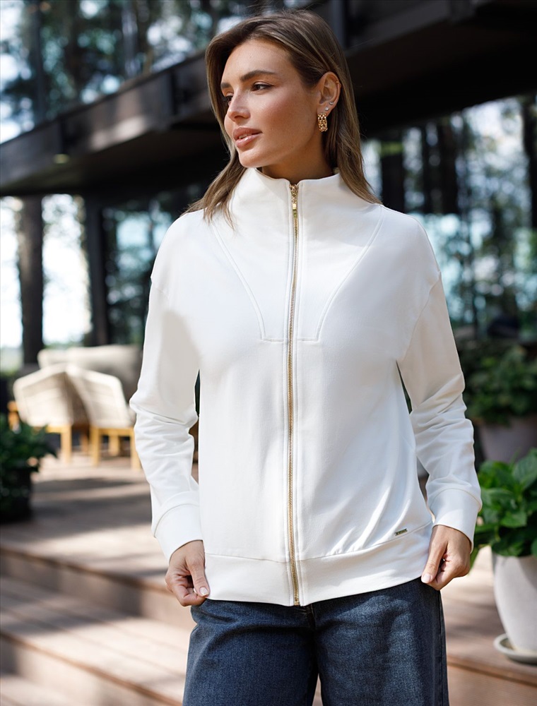 Плотность: 240 Г/м2 Параметры модели на первом фото: Рост 170, бюст 89, талия 63, бедра 92 Жакет выполнен из футера двухнитки с эластаном. Модель без карманов с воротом стойка и застежкой на молнию золотистого цвета. Эластичный материал гарантирует комфорт и формоустойчивость. Сочетается в костюме с брюками D44.138, D44.139, D44.140 и шортами D48.008. Изделие дополнено металлическим логотипом бренда. Комментарии к товару