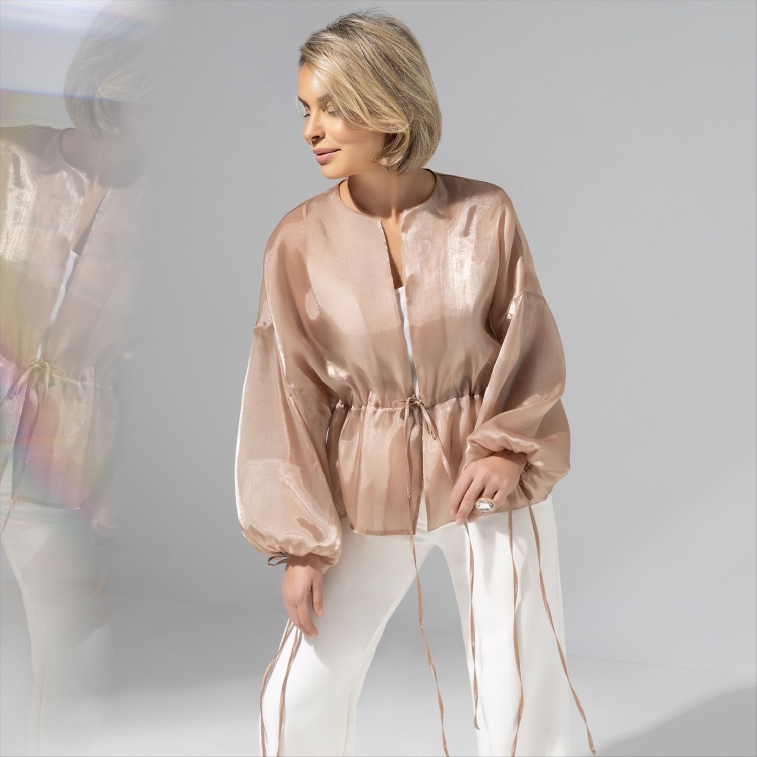 Жакет из органзы «Вершина восхищения (new)» — это воплощение элегантности и утонченности, способное украсить любой гардероб. Легкость и воздушность ткани создают ощущение невесомости, а идеальный бежевый оттенок превращает его в универсальный элемент вашего стиля. Этот женский жакет станет настоящей находкой для тех, кто ценит высокую моду и стремится выделиться из толпы. Опциональная покупка оптом позволит вам предложить своим клиентам эксклюзивное изделие, которое станет жемчужиной их коллекции. В мире, где стиль и комфорт должны идти рука об руку, жакет из органзы становится неотъемлемой частью гардероба современной женщины. Спущенная линия рукава и объемные манжеты с длинными завязками придают образу романтичную легкость и изысканность. Этот жакет идеально подойдет как для торжественных мероприятий, так и для повседневного ношения. Подчеркните свою индивидуальность и выделитесь на фоне серой массы с помощью этого уникального изделия, доступного для покупки оптом. Если вы ищете способ разнообразить ассортимент вашего магазина и предложить клиентам что-то действительно особенное, жакет из органзы станет идеальным выбором. Эффектный дизайн и полупрозрачность ткани добавят загадочности и шарма любому образу. Ваша аудитория оценит внимание к деталям и качество, которыми обладает этот женский жакет. Приобретая его оптом, вы сможете не только удовлетворить спрос, но и повысить престиж вашего бизнеса, предлагая покупателям нечто большее, чем просто одежду. Комментарии к товару