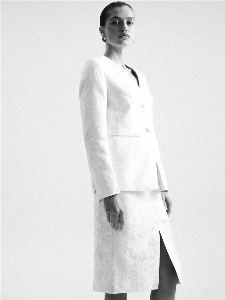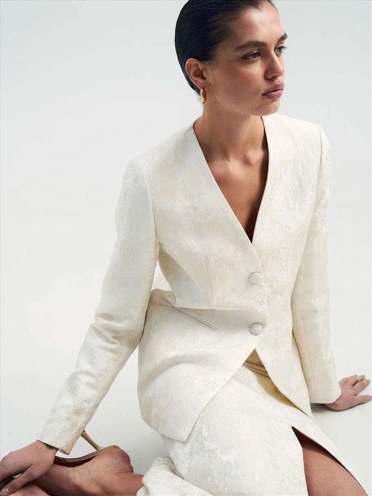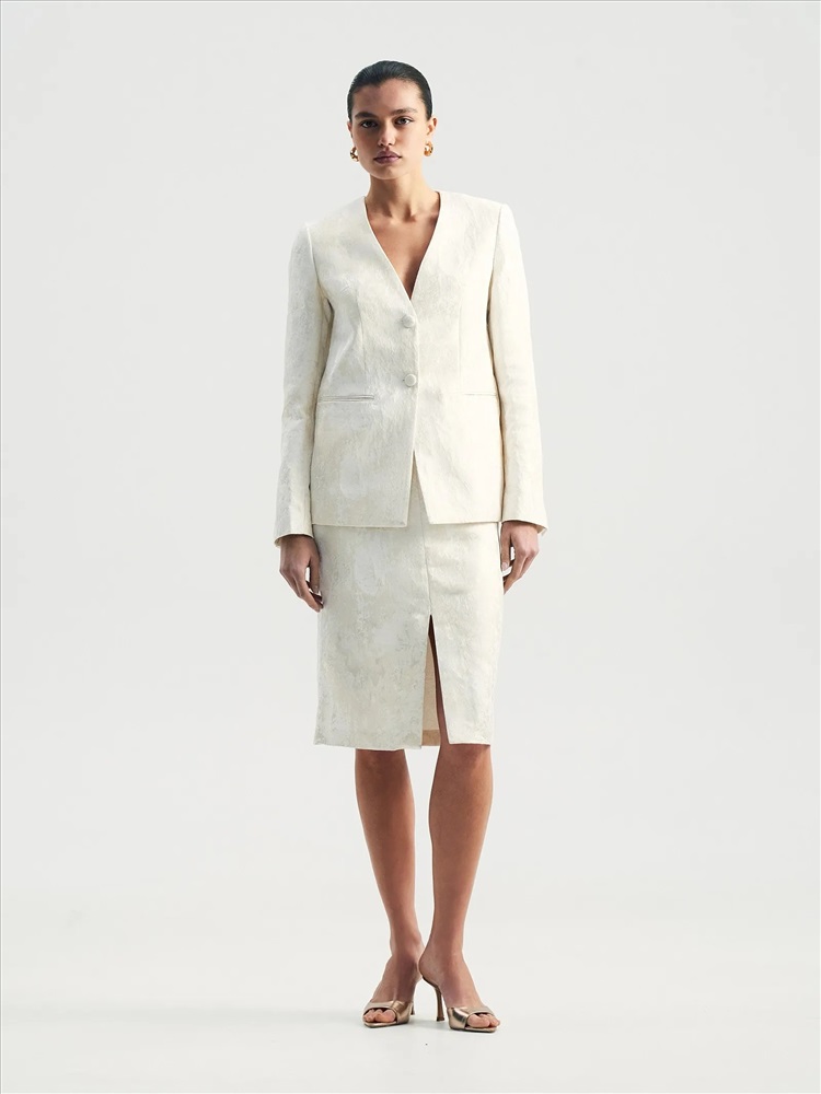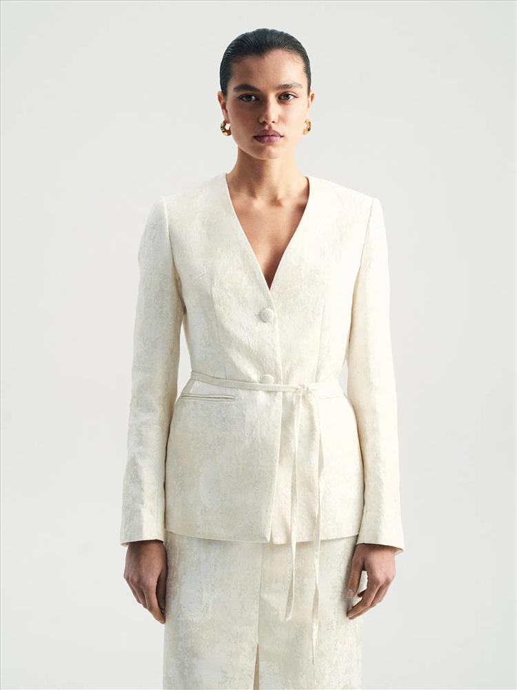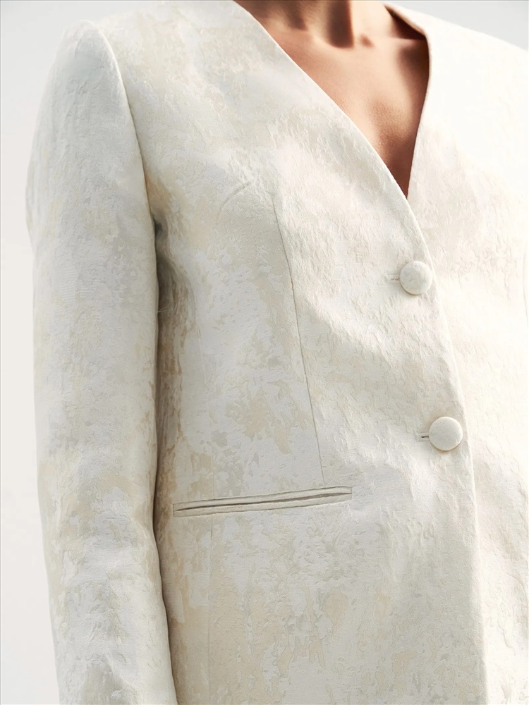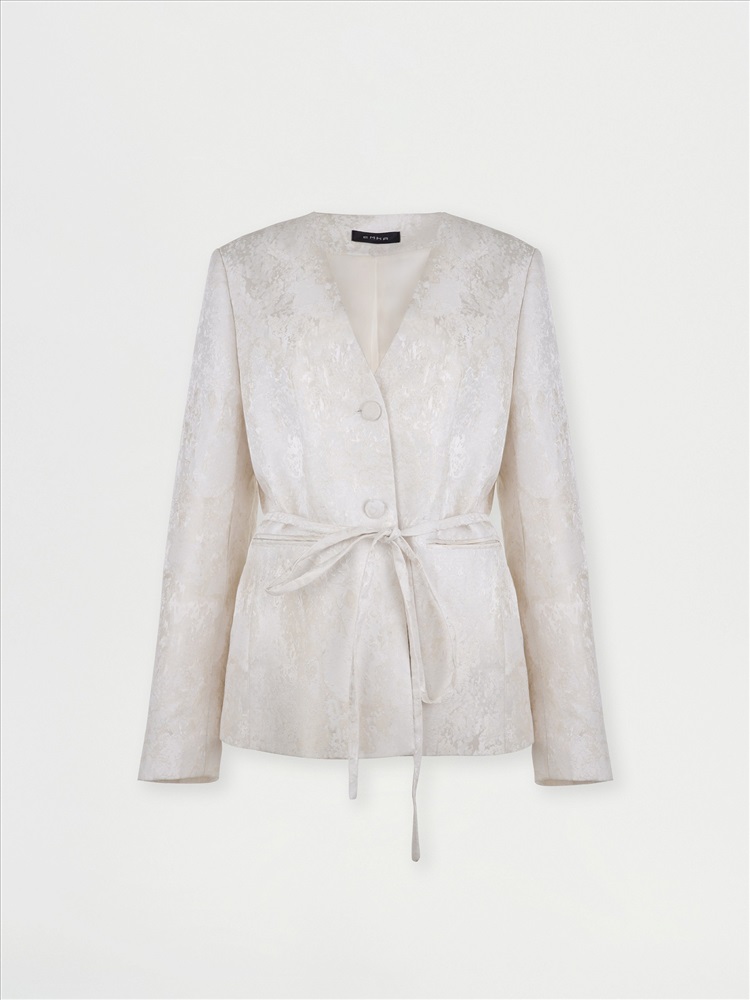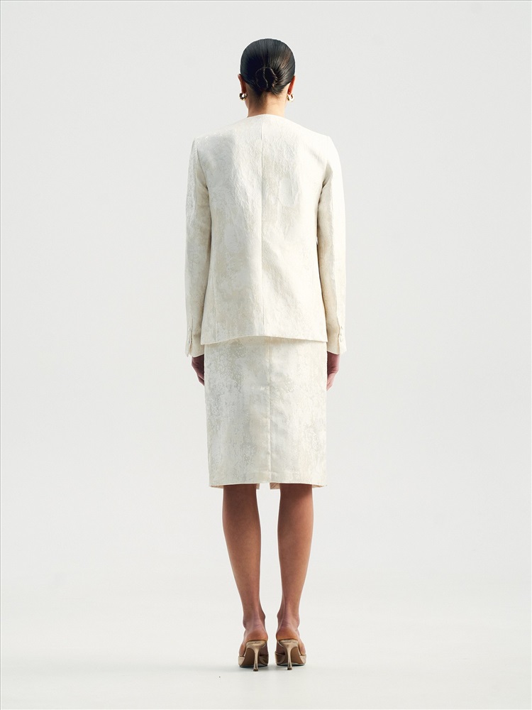 Идеальный жакет для торжественных случаев или для того, чтобы создать себе ощущение праздника каждый день. Сделан из роскошного двухтонного жаккарда — кремовый узор на сливочном фоне. Сочетание двух оттенков молочного цвета создаёт дорогой и изысканный образ. Материал наполовину состоит из натурального хлопка. Дополняет жаккард гладкая молочная подкладка с высоким содержанием вискозы. Прямой жакет можно приталить поясом, который идёт в комплекте. Элегантная модель без лацканов имеет V-вырез, тонкие карманы с листочками и две обтянутые тканью пуговицы. Смотрится свежо и утончённо. Завершить образ с жакетом можно юбкой из комплекта.