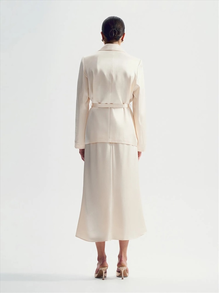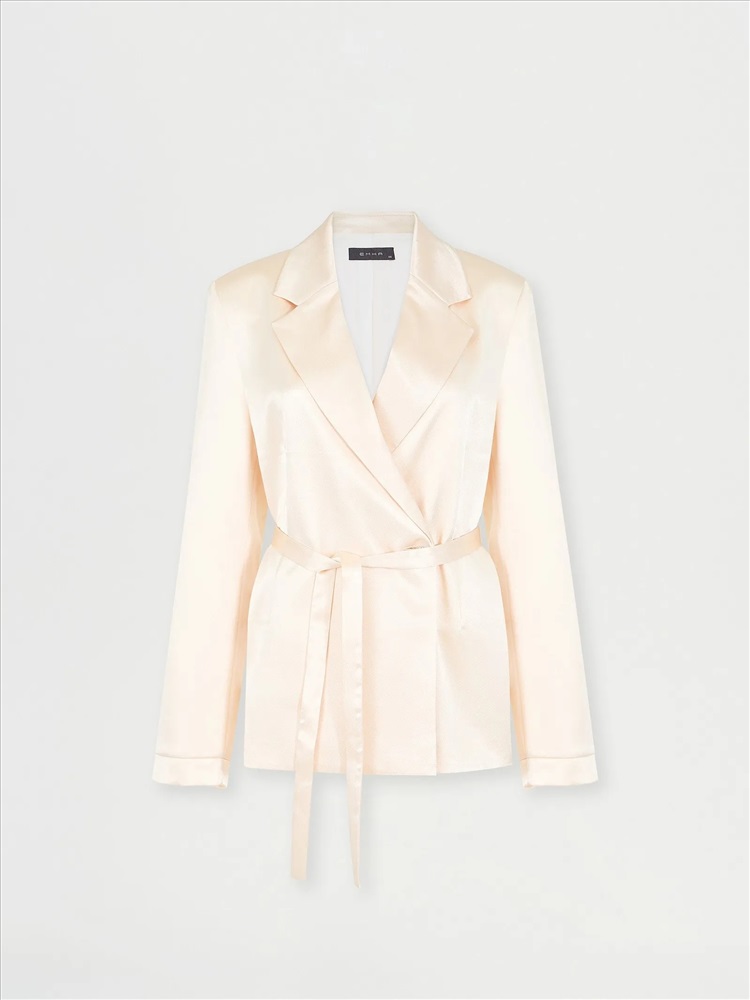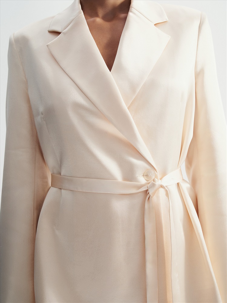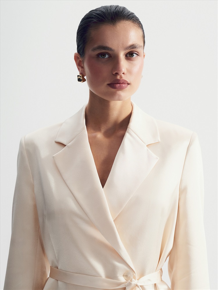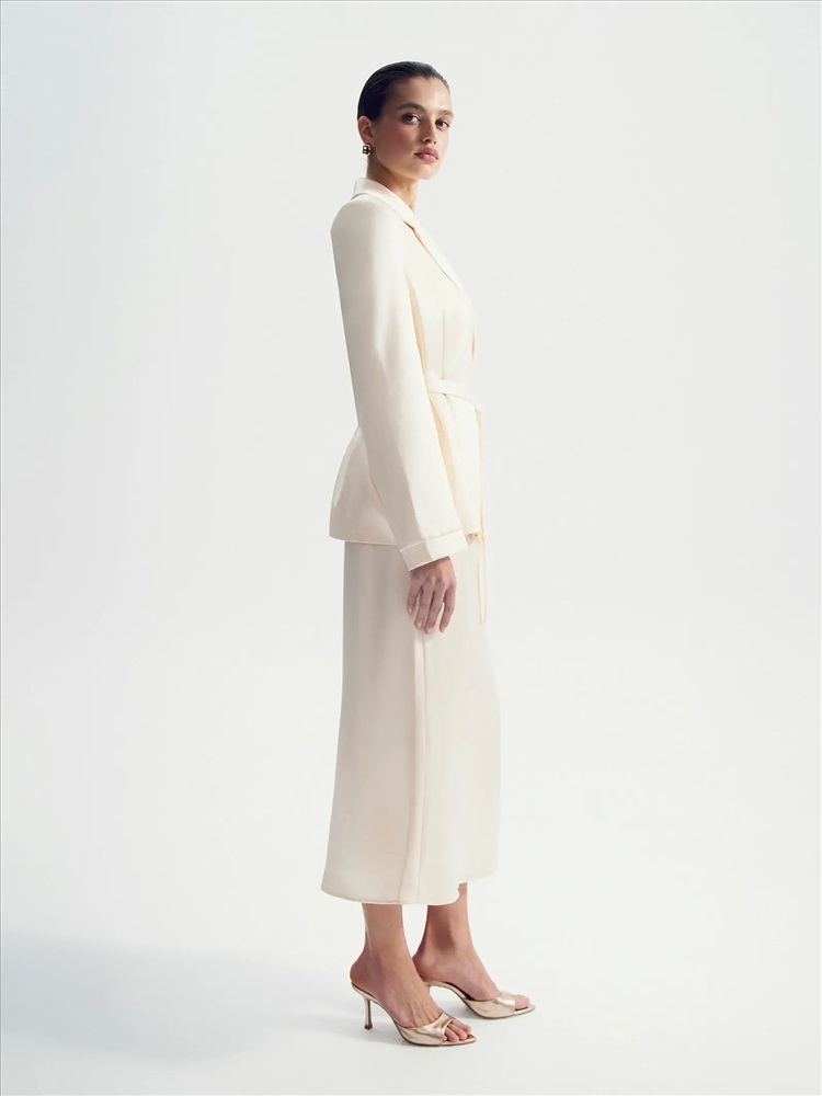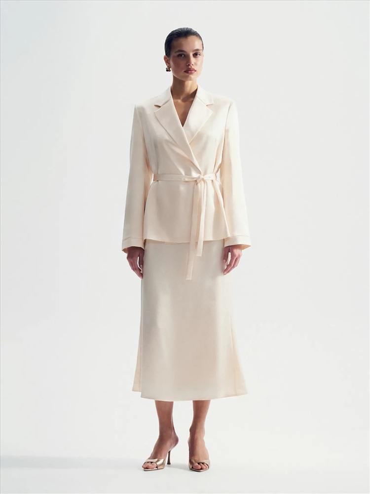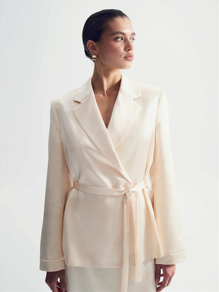 Интересное прочтение бельевого стиля. Атласный жакет с лацканами и поясом станет нетривиальным выбором для особых случаев. Нежный сливочный оттенок делает образ особенно элегантным.