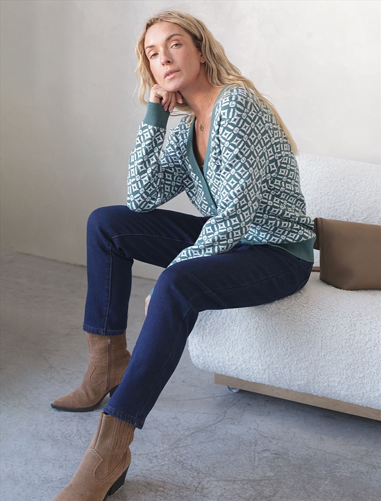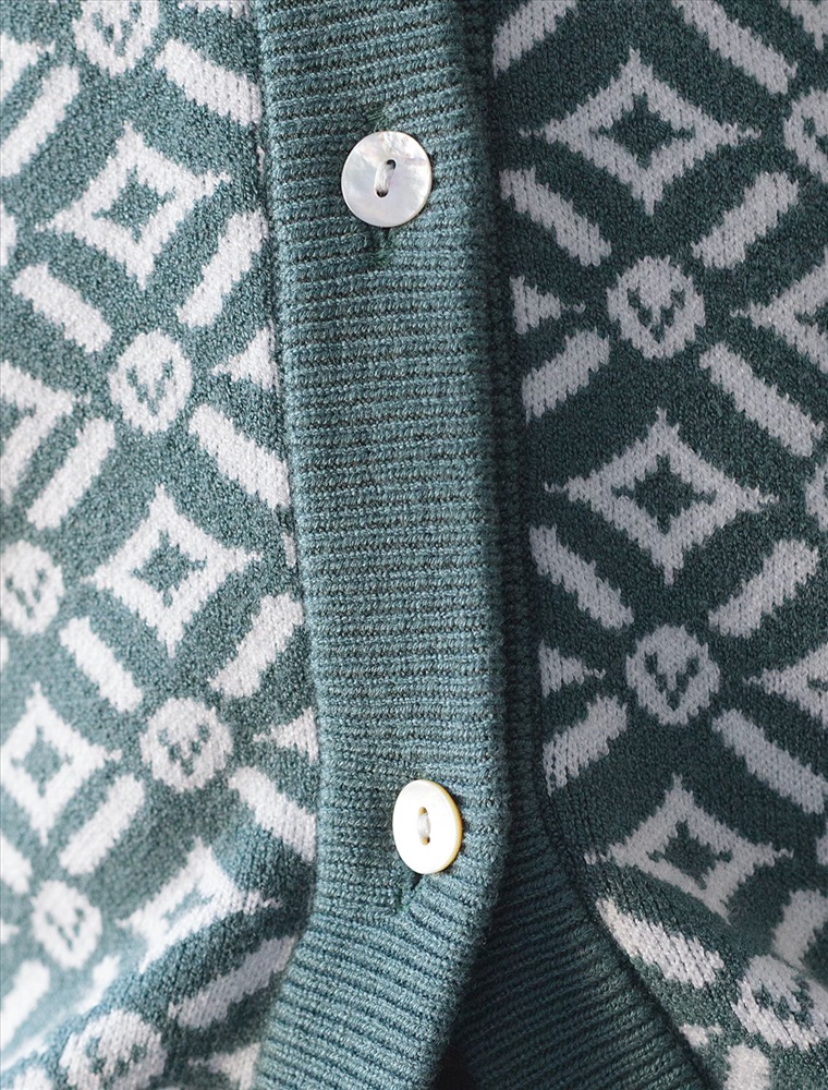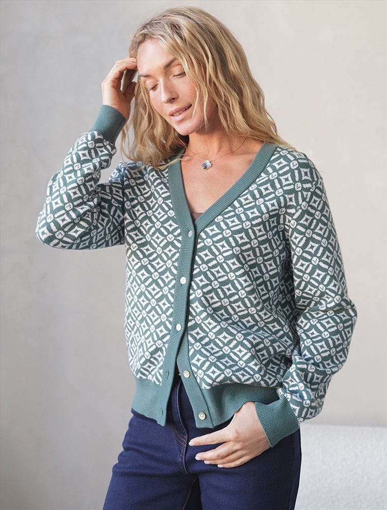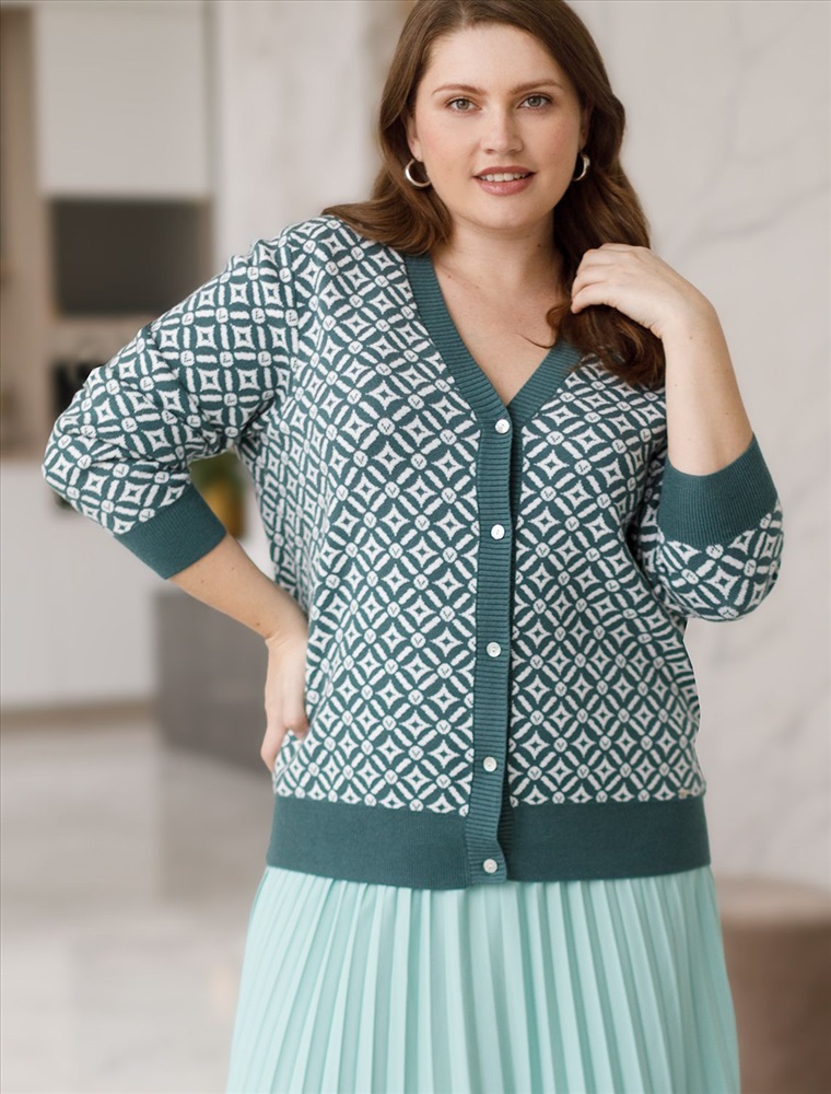 Жакет полынного цвета выполнен из мягкого трикотажа на основе шелковистой эластичной поливискозы. Жаккардовое переплетение образует геометрический узор. Застежка на перламутровые пуговицы подчеркивает гладкую пряжу. Жаккардовое вязание - это один из самых дорогих способов изготовления трикотажных изделий, так как для вязания используется сразу несколько цветов нитей. Жаккард вяжется намного дольше, чем однотонное полотно, имеет гораздо больший вес и плотность. Благодаря этому трикотаж дольше сохраняет красивый внешний вид, не пилингуется и не подвержен спуску петель. Модель станет удачной инвестицией в базовый гардероб. Комфортно носить даже на голое тело или как накидку.