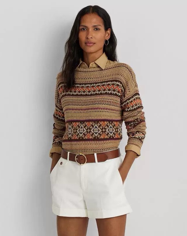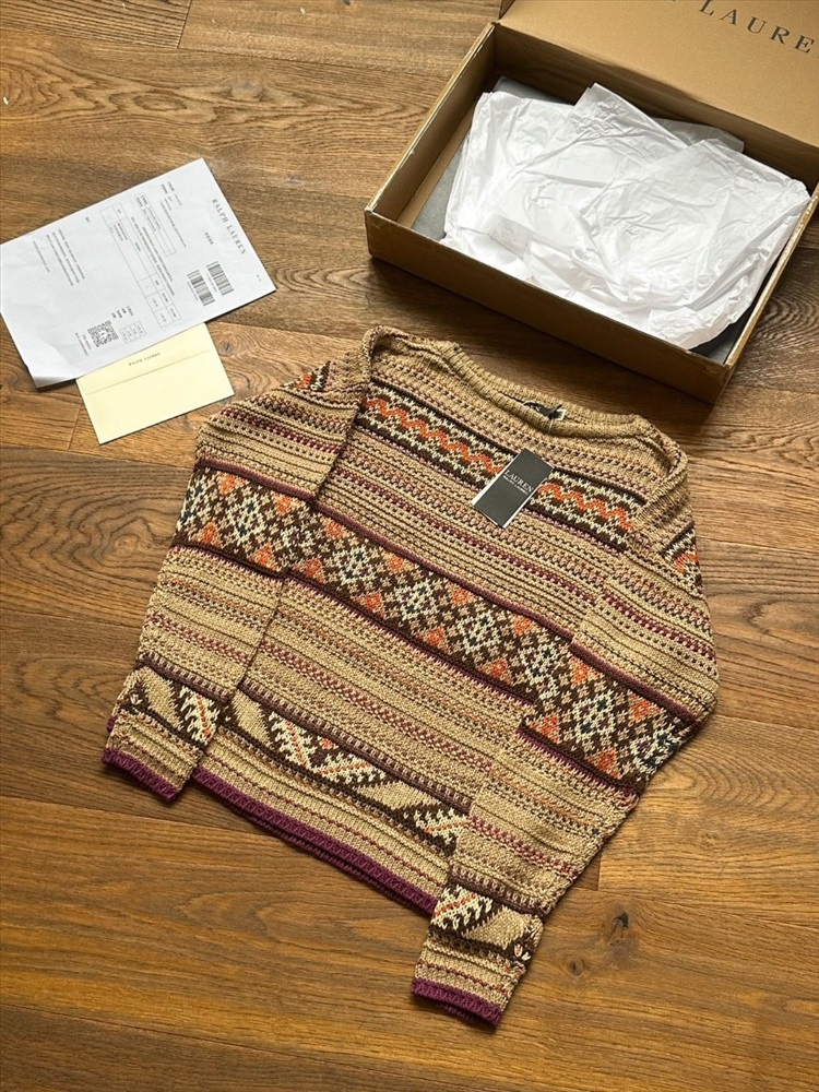 Жаккардовый свитер Fair Isle с круглым вырезом от Ralph Lauren Пряжа окрашена в 9 различных цветов: кофейный/темно-кофейный/светло-фиолетовый/коричневый/светло-абрикосовый/абрикосовый/синий/оранжевый/темно-фиолетовый. Она полностью соответствует оригинальной индивидуальной процедуре плетения и крашения. На изготовление пряжи уходит не менее 20 дней. красить действительно очень долго и трудоемко!! Время тратится на повторную корректировку цветов окрашивания. Так много цветов нужно сопоставлять один за другим. Если один цвет неправильный, это повлияет на общее ощущение. Жаккардовый узор Fair Isle вяжется на ткацком станке Stoll 7, импортированном из Германии. В нем используется оригинальный процесс интарсии из пряжи. Эта часть требует больше всего пряжи и требует больше времени для плетения, чем обычные вязаные свитера.