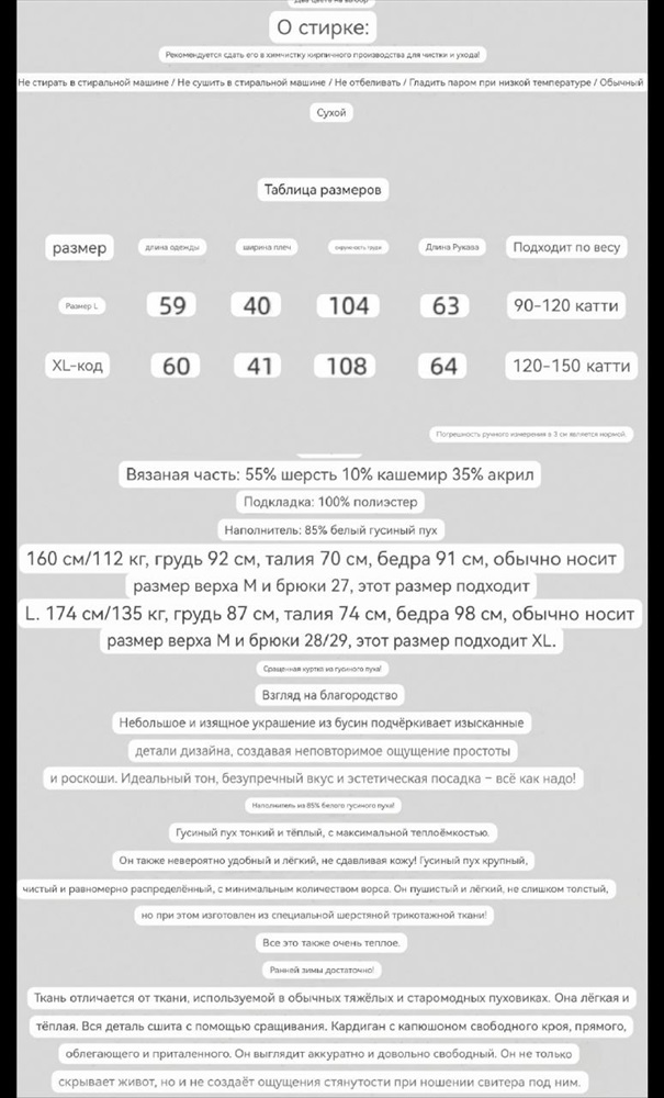 Материал: шерсть, кашемир, акрил. Наполнение внутри - гусиный пух 85% Размеры: L XL Комментарии к товару