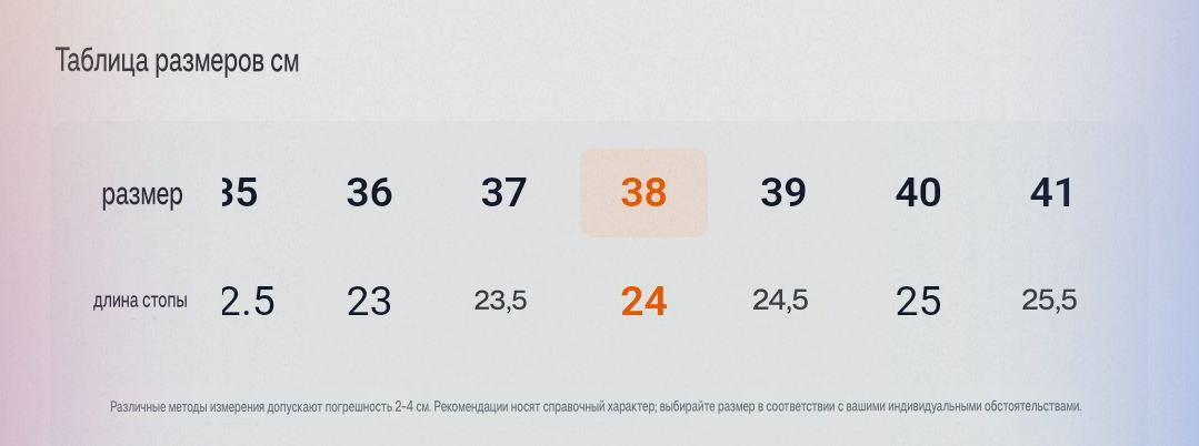 Размер: 35 22,5см, 36 23см, 37 23,5см, 38 24см, 39 24,5см, 40 25см, 41 25,5см
