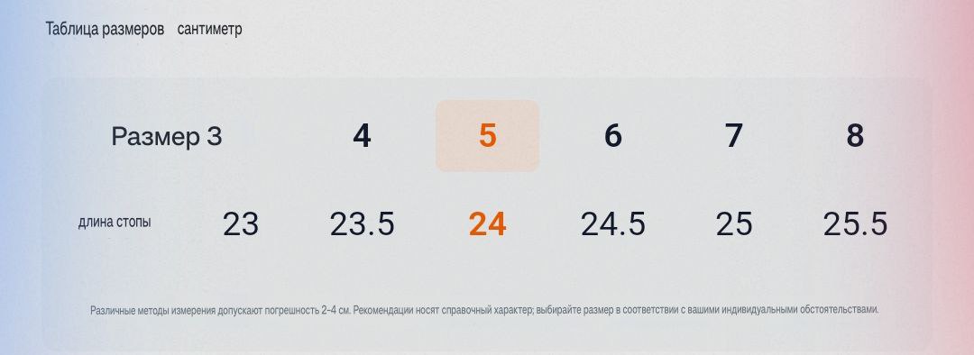Размер: 36 - 23 см, 37 - 23,5 см, 38 - 24 см, 39 - 24,5 см, 40 - 25 см, 41 - 25,5 см