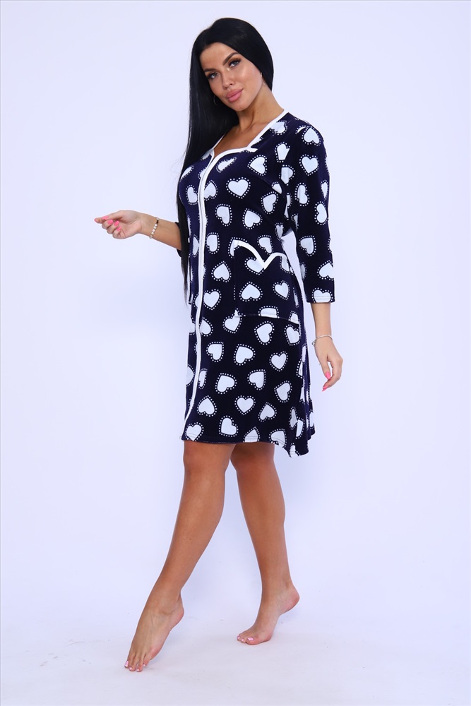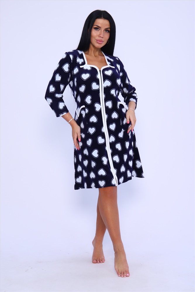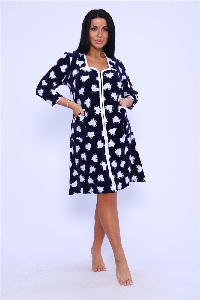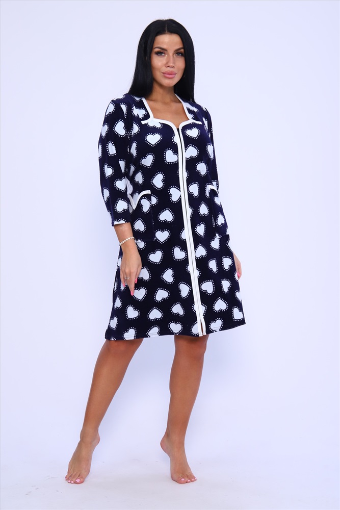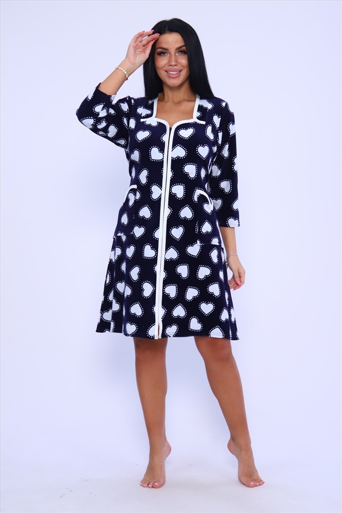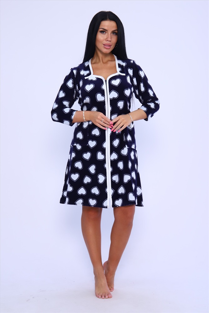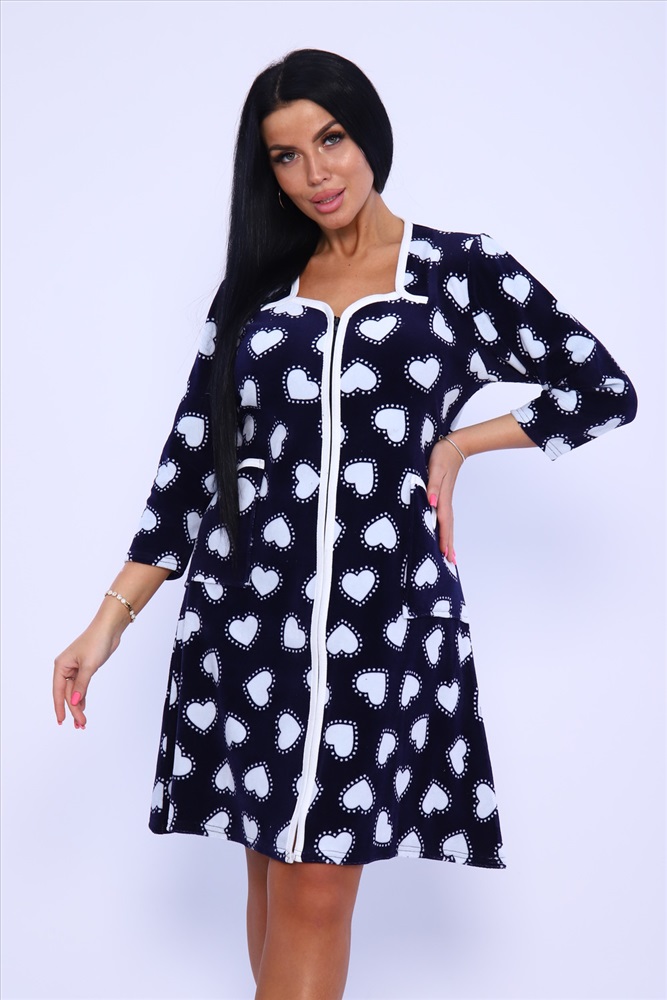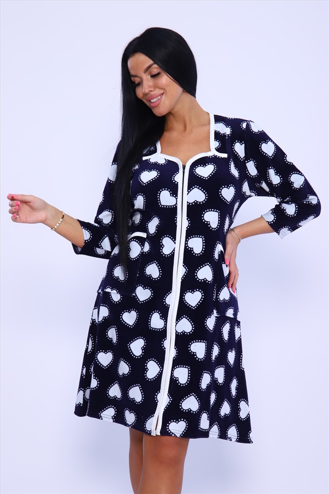 Застежка: молния Уютный домашний женский халат на молнии. Выполнен из велюра, с двумя карманами, рукава чуть ниже локтей, общая длина приблизительно до коленей. Очень теплый и приятный к телу.