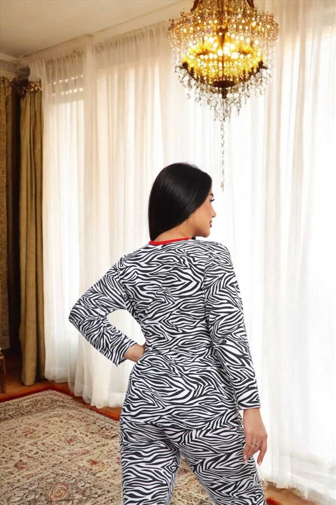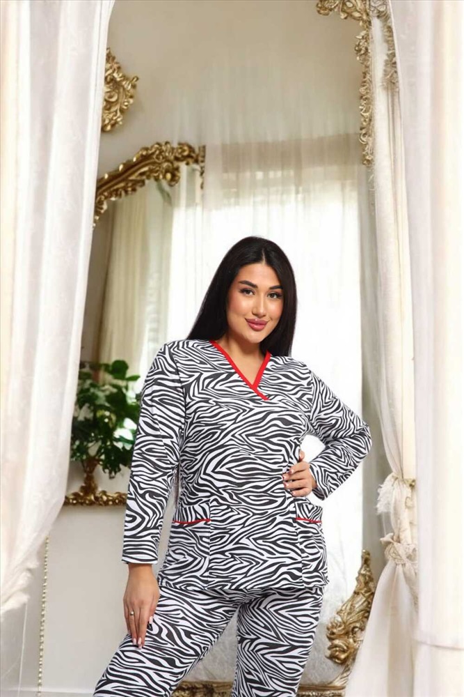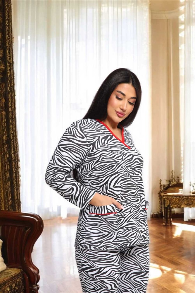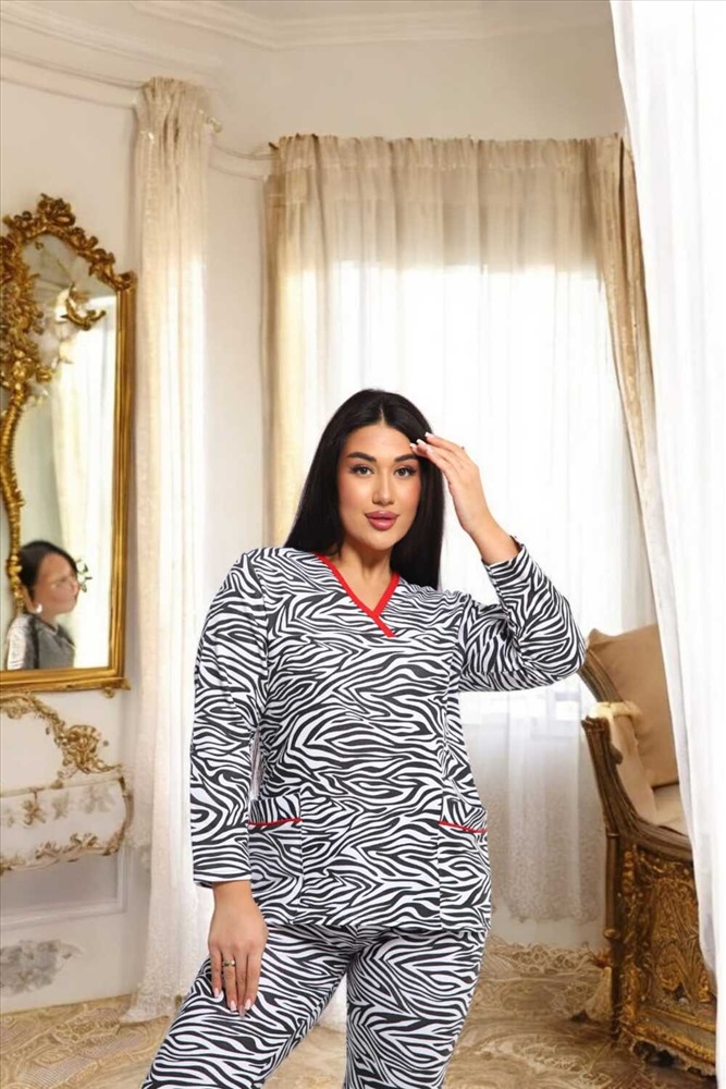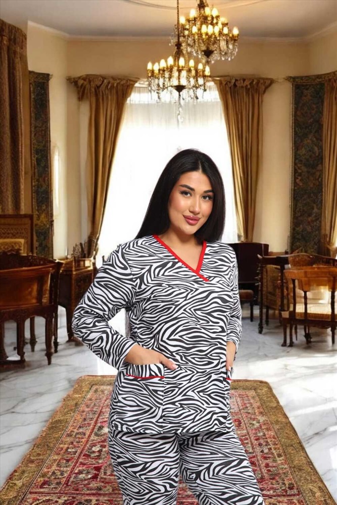 Воротник: без воротника Стильный комплект с принтом зебра сочетает в себе комфорт и модный дизайн. Черно-белый узор придает образу динамичность, а контрастная красная окантовка V-образного выреза добавляет изюминку. Верх оснащен функциональными карманами, а удобный крой брюк обеспечивает комфорт в течение всего дня. Этот комплект выполнен из мягкой и дышащей ткани, идеально подходящей для повседневной носки или особых случаев.